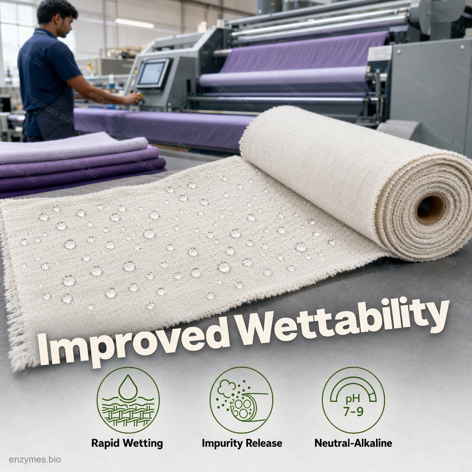 - يحسن جودة النسيج عن طريق الحد من البكتين والشوائب ذات الصلة التي يمكن أن تؤثر على توحيد المعالجة