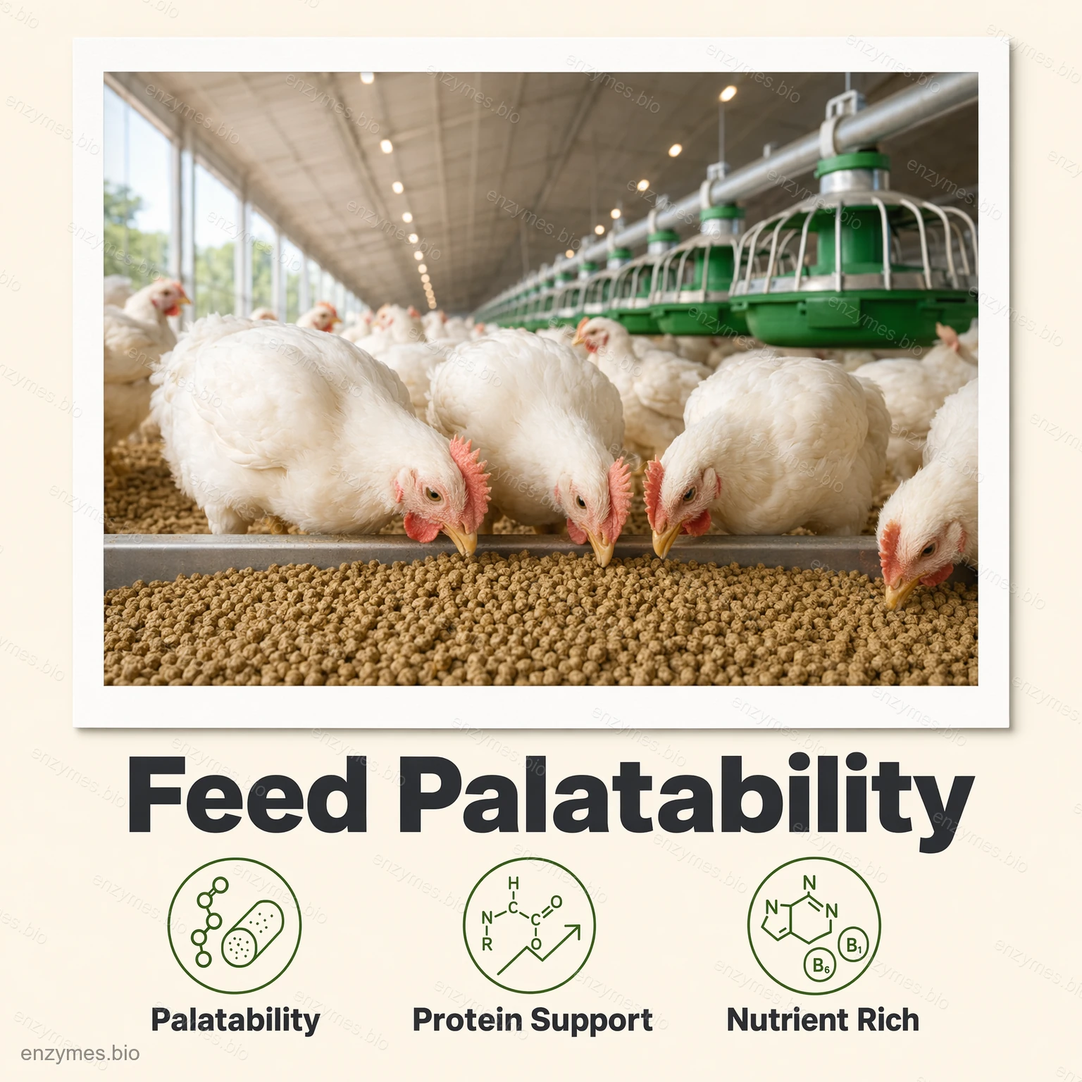 - مع رائحة الخميرة، إنه منشط طبيعي وجيد لعملية البلعمة والذي من الممكن أن يعزز مذاق العلف الحيواني.