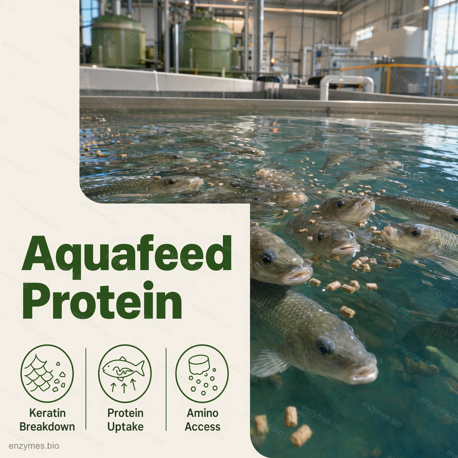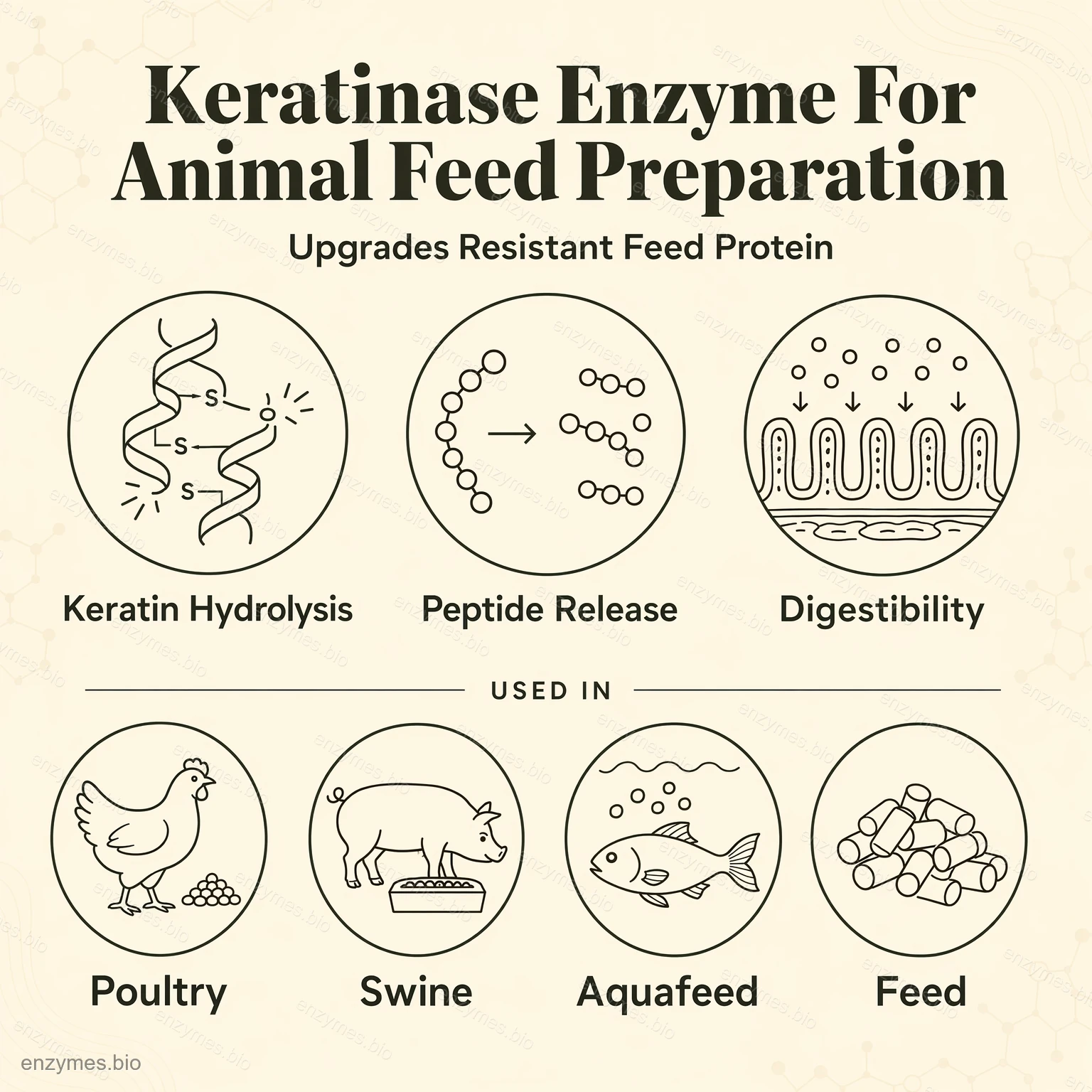 Keratináza se vyrábí submerzní fermentací Aspergillus niger s následnou purifikací a formulací. Je to proteáza se širokou specificitou schopnou degradovat ve vodě rozpustné i nerozpustné proteiny. Je schopen účinně hydrolyzovat keratin na menší peptidy a aminokyseliny, čímž překonává většinu proteáz, které nedegradují keratin. Keratin se běžně vyskytuje v srsti, peří, rohovině, kopytech a rybích šupinách. Obsahuje vysoké množství zesíťovaných disulfidových vazeb a hydrofobních aminokyselin tvořících velmi pevnou strukturu a je velmi odolný vůči proteolýze. Keratináza je jedinečná v tom, že obsahuje multifunkční silné enzymatické aktivity napadající disulfidové vazby a peptidové vazby, a tak účinně depolymeruje keratin, čímž zvyšuje stravitelnost krmiva obsahujícího protein s podobnou strukturou.