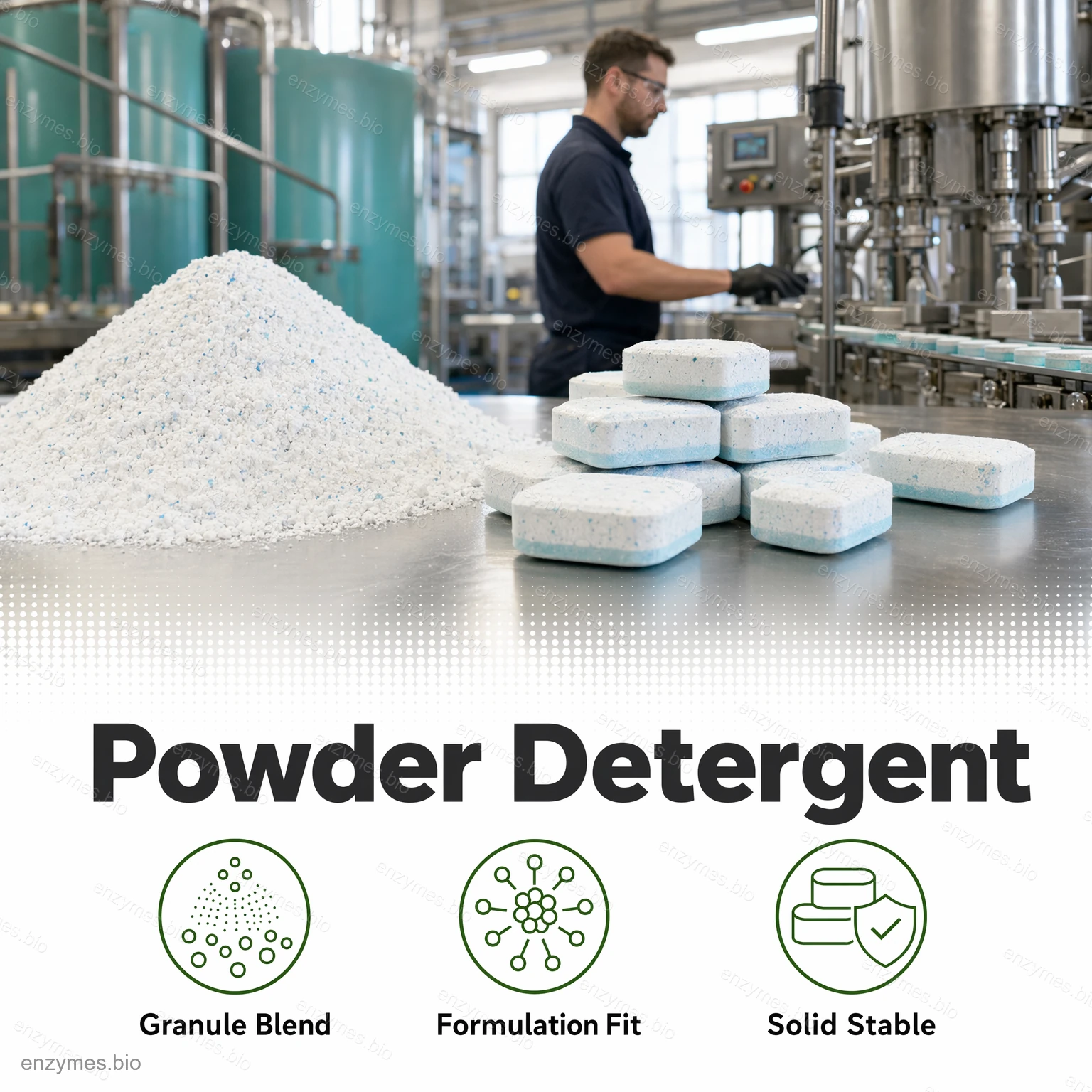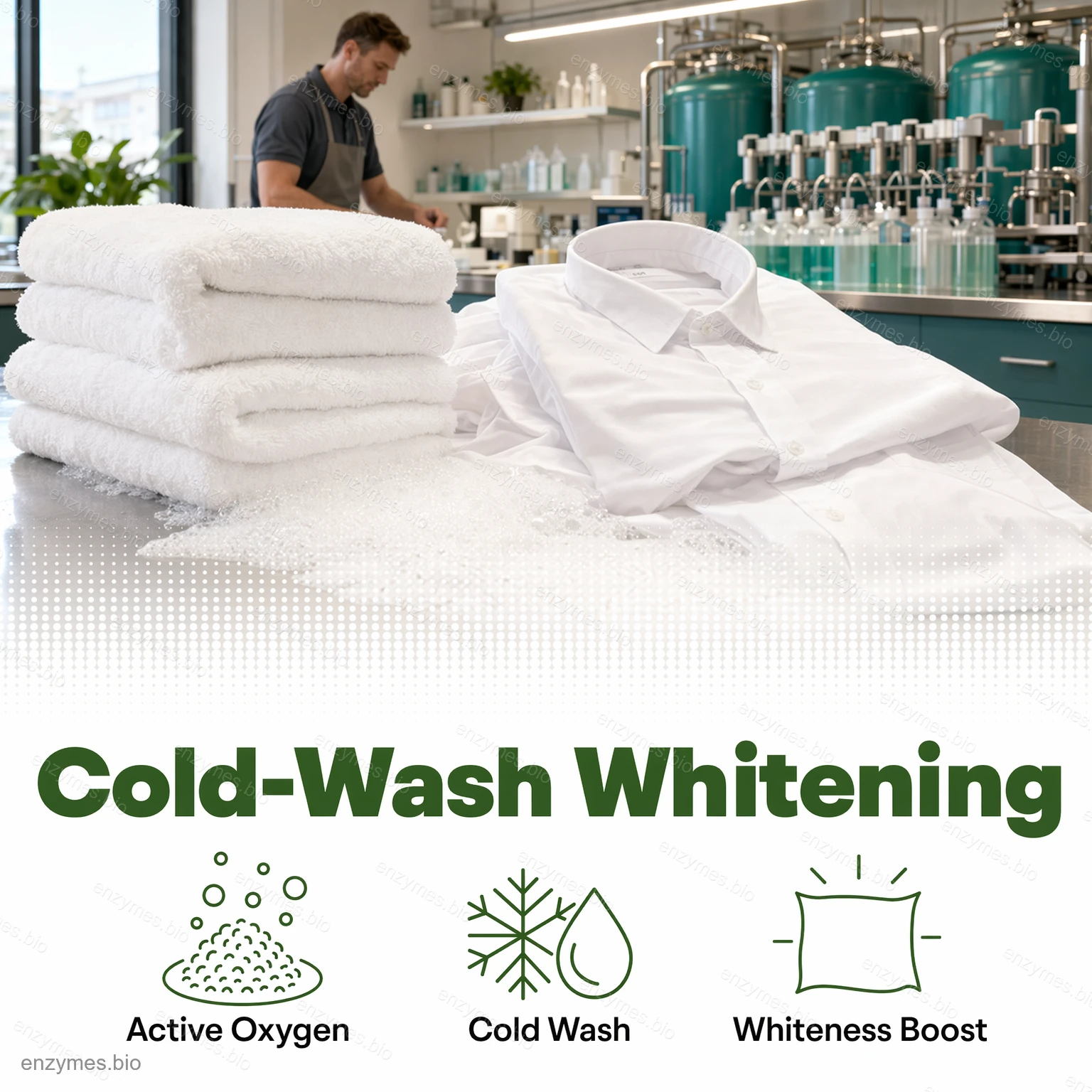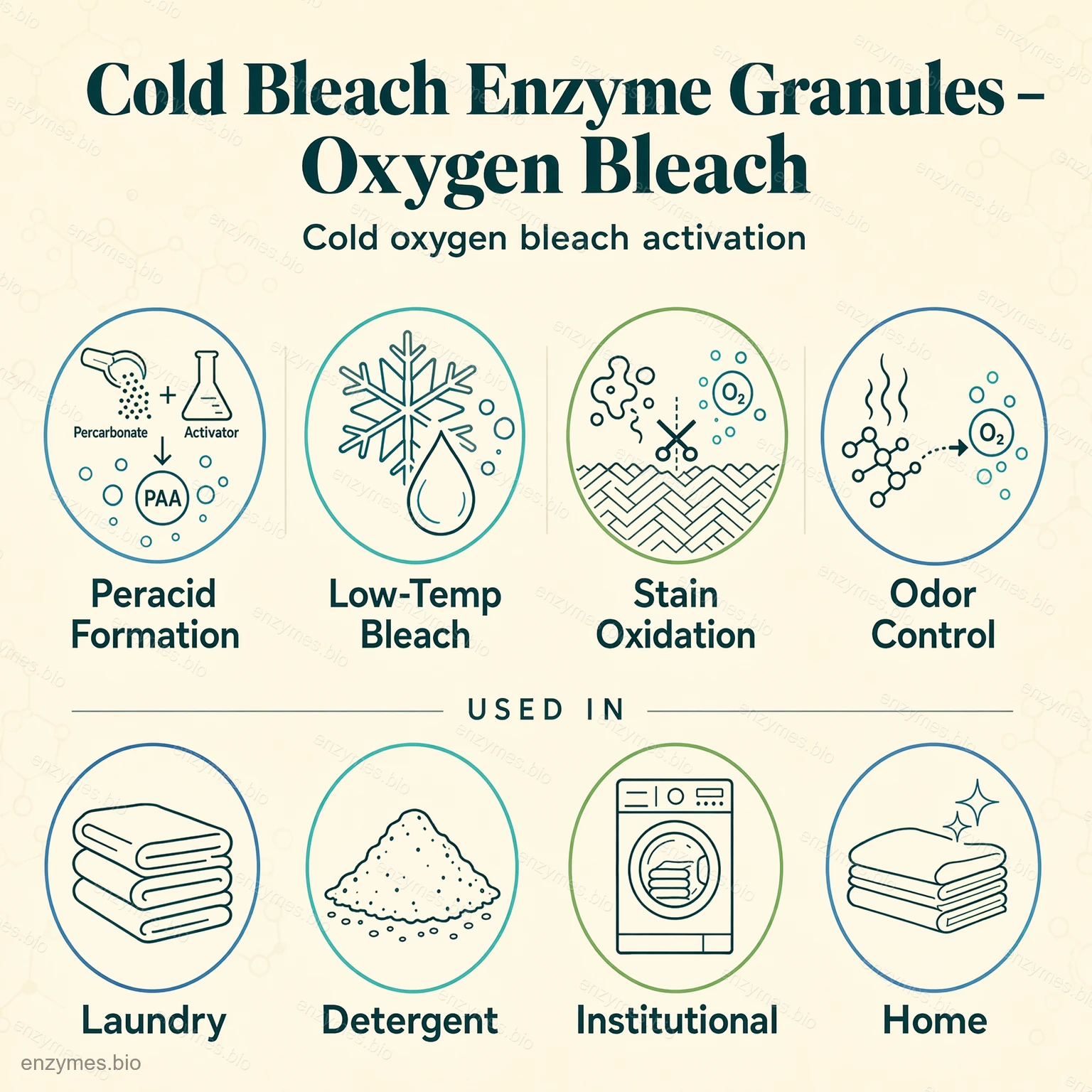 Enzymové granule pro bělení za studena je aktivátor nízkoteplotního kyslíkového bělení nové generace, vyvinutý pro zvýšení účinnosti práškových a pevných pracích prostředků. Je určen pro moderní, energeticky úsporné prací systémy a zvyšuje účinnost oxidačního bělení perkarbonátu sodného a podobných bělicích systémů na bázi kyslíku, čímž umožňuje vynikající odstranění skvrn a bělení i při teplotách pouhých 15 °C.