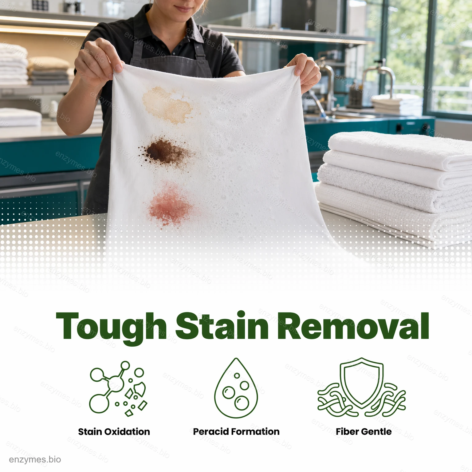 Po rozpuštění ve vodě působí synergicky s perkarbonátem a vytváří peroxooctová kyselina a další aktivní formy kyslíku. Tyto vysoce reaktivní sloučeniny mají silné oxidační a dezinfekční účinky a účinně rozkládají odolné organické a oxidovatelné skvrny, jako jsou čaj, káva, ovocné šťávy a tělesné nečistoty. Výsledkem je znatelně bělejší a svěžejší prádlo s lepší hygienickou ochranou a dlouhodobou čistotou.