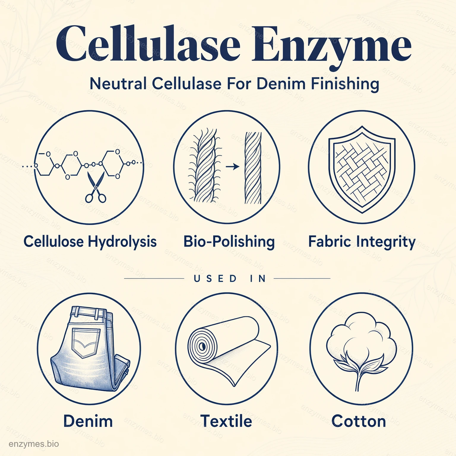Cellulose er en glucosepolymer forbundet med β-1,4-glykosidbindinger. Cellulasesystemet består af tre hovedkomponenter: endoglucanase (endo-1,4-β-D-glucanase eller EG), cellobiohydrolaser (exo-1,4-β-D-glucanaser eller CX eller CBH) og β-glucosidaser (1,4-β-D-glucosidase; BG; BGL). Disse aktiviteter virker synergistisk på cellulose for effektivt at omdanne den til glukose. Produktet er designet til enzymatisk at slibe denim uden at skade stoffet.