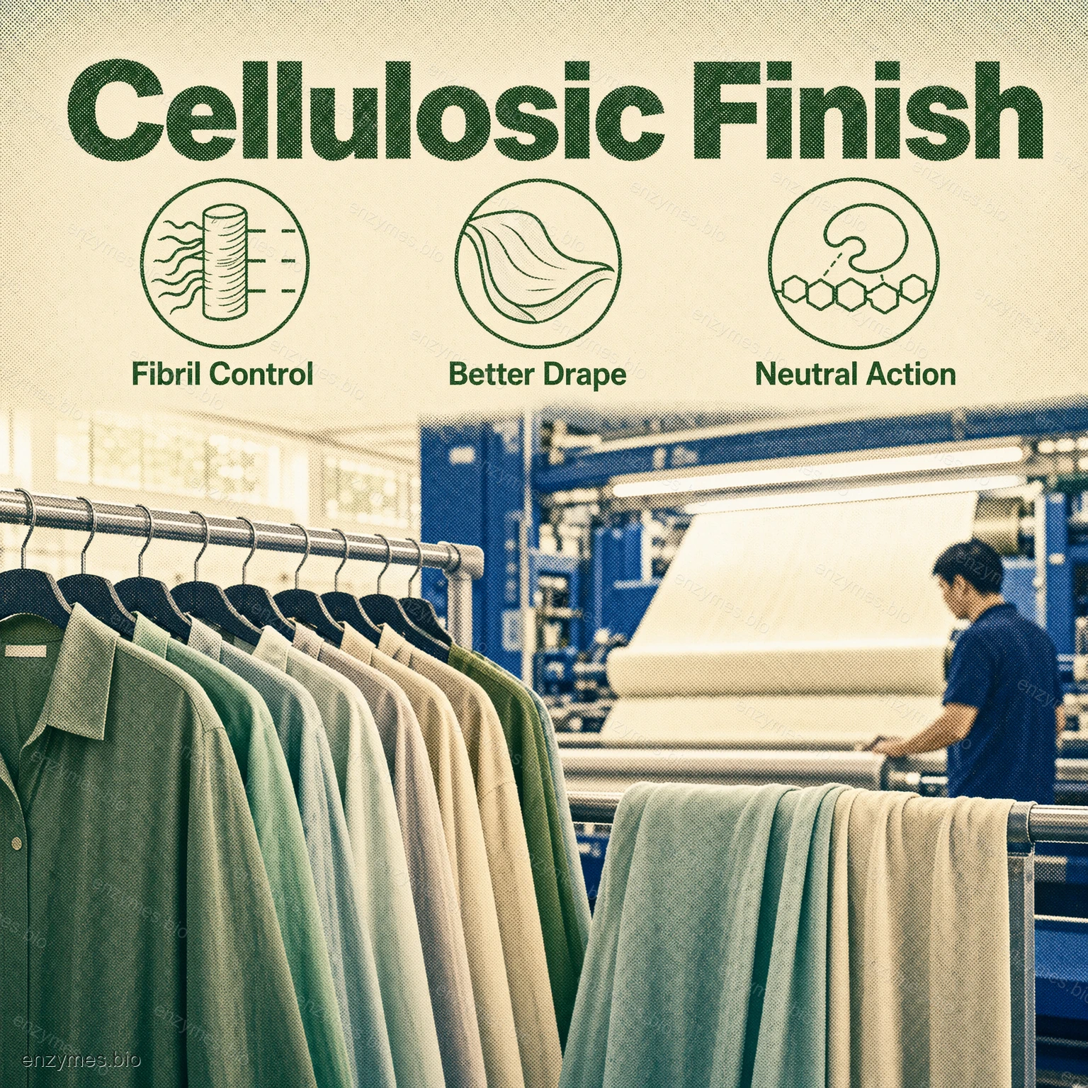 Η κυτταρίνη είναι ένα πολυμερές γλυκόζης συνδεδεμένο με β-1,4-γλυκοσιδικούς δεσμούς. Το σύστημα κυτταρινάσης αποτελείται από τρία κύρια συστατικά: ενδογλυκανάση (ενδο-1,4-β-D-γλυκανάση ή EG), κυτταροβιοϋδρολάσες (εξω-1,4-β-D-γλυκανάσες, ή CX, ή CBH) και β- γλυκοσιδάσες (1,4-β-D-γλυκοσιδάση, BG, BGL). Αυτές οι δραστηριότητες λειτουργούν συνεργιστικά στην κυτταρίνη, μετατρέποντάς την αποτελεσματικά σε γλυκόζη. Το προϊόν έχει σχεδιαστεί για να τρίβει ενζυματικά το τζιν χωρίς να βλάπτει το ύφασμα.