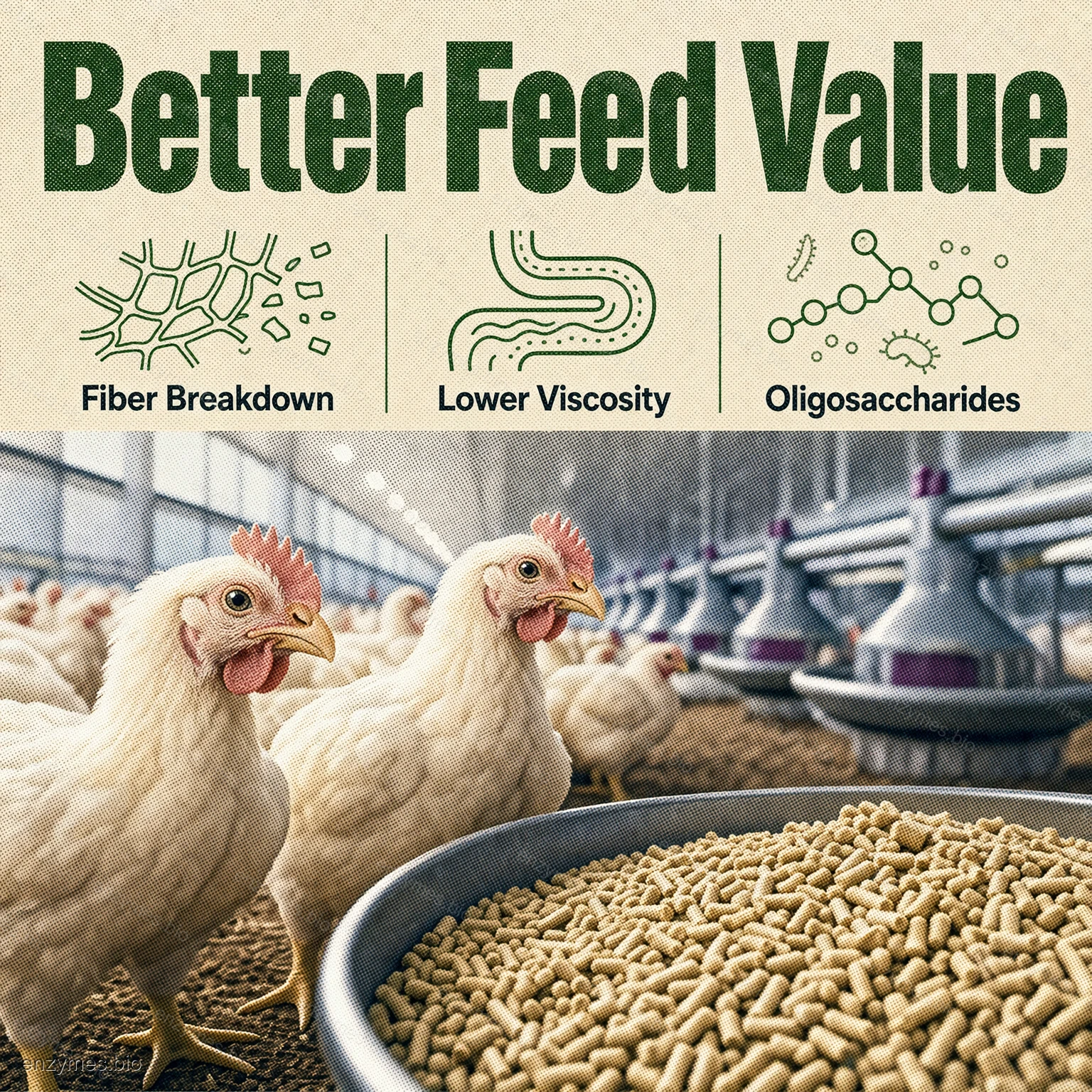 Τροφή: Με την αποικοδόμηση της κυτταρίνης, μειώνει το ιξώδες της τροφής στον πεπτικό σωλήνα του ζώου, αποσυνθέτει την τροφή για να αυξήσει την έγχυση πεπτικών ενζύμων, διασπά τη δομή των κυττάρων για να απελευθερώσει θρεπτικά συστατικά και ελευθερώνει ολιγοσακχαρίτες καλούς για τα ευεργετικά βακτήρια στον πεπτικό σωλήνα. Συνολικά, το προϊόν βελτιώνει τη βιολογική αξία των ζωοτροφών, συμβάλλει στην καλή διαβίωση των ζώων και αποφέρει οφέλη στους αγρότες.