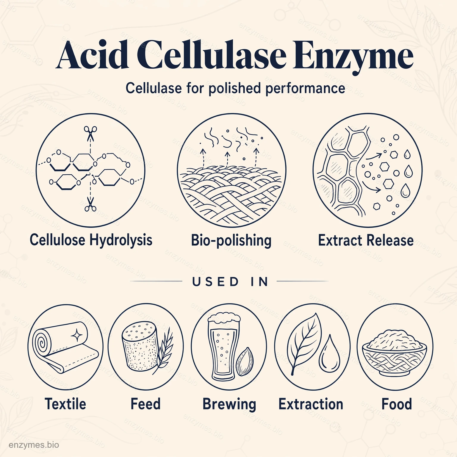 Υφασμα: Χρησιμοποιείται για ραφινάρισμα ινών, βιο-γυάλισμα, φινίρισμα και βαφή στην κλωστοϋφαντουργία, με τα πλεονεκτήματα ενός ωραίου φινιρίσματος, λιγότερης απώλειας βάρους, περισσότερη απαλότητα, μεγαλύτερη αντοχή του υφάσματος, ευκολότερη και ταχύτερη βαφή, πρόληψη θολώματος κ.λπ. .