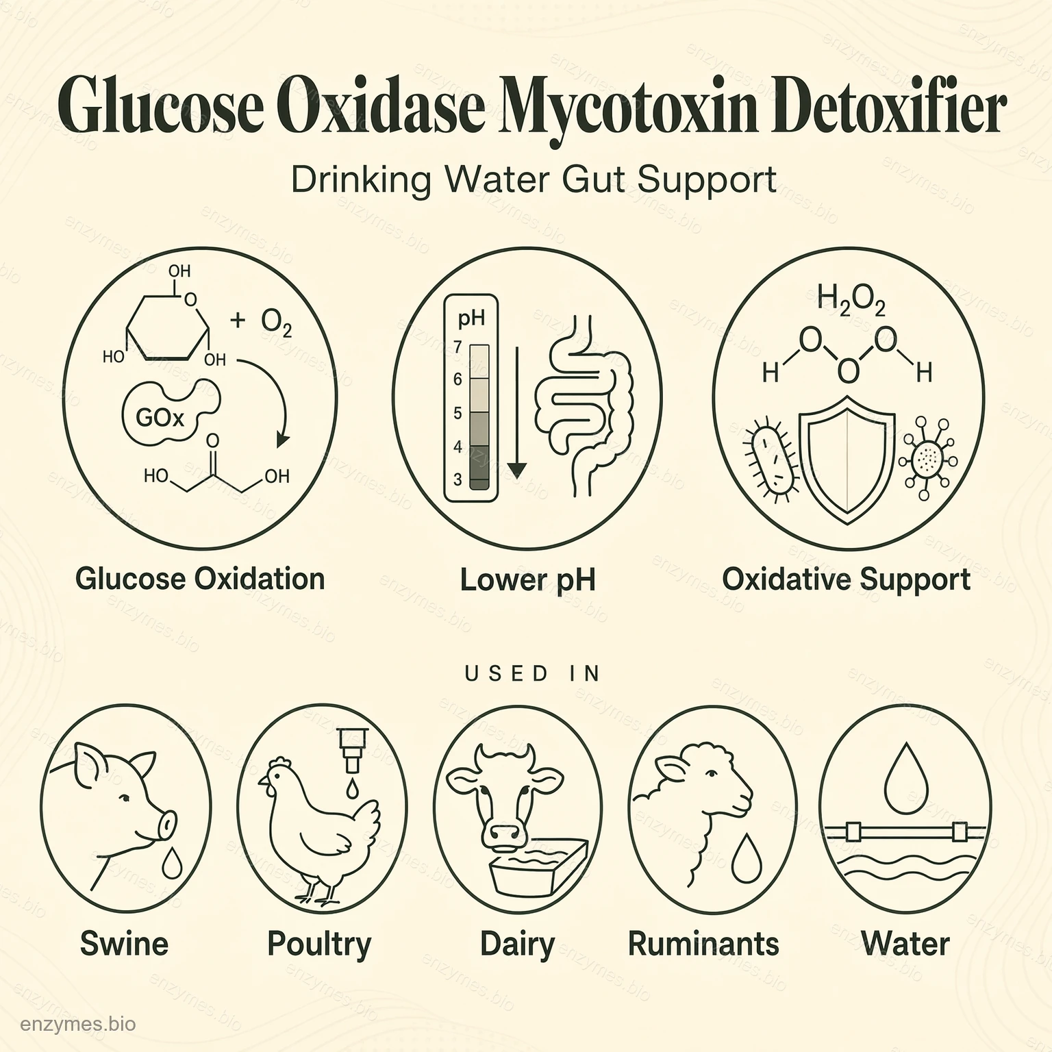Glucosa oxidasa (aplicación en agua potable) es una solución enzimática de grado alimenticio desarrollada para sistemas de producción ganadera y avícola con el fin de favorecer la salud intestinal, el equilibrio microbiano y la gestión del riesgo de micotoxinas mediante su administración en el agua potable. Es adecuada para cerdos, ganado vacuno, ovejas, cabras, pollos de engorde, gallinas ponedoras, patos y otros animales de granja.