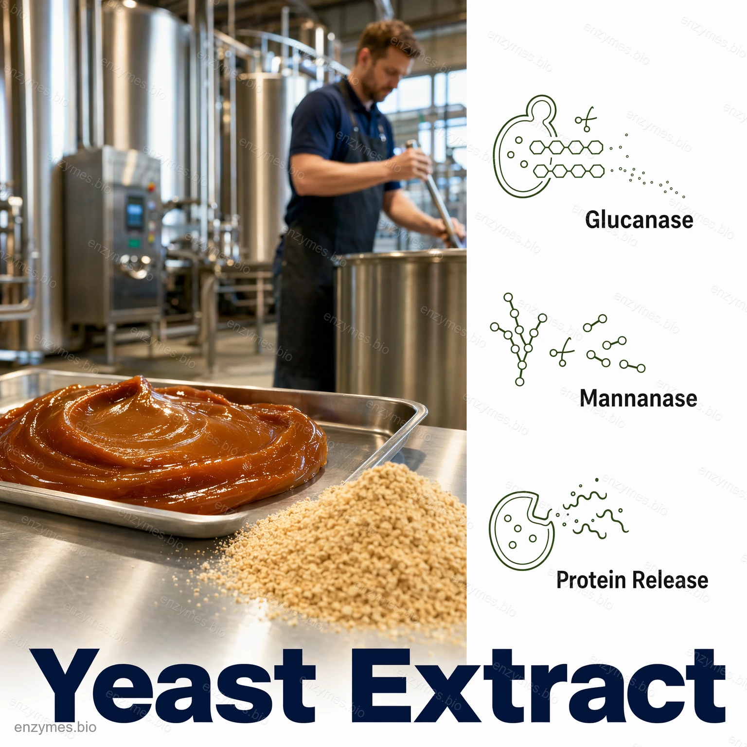 La pared celular de la levadura está formada por polisacáridos como mananos, dextrano, metanosomas, proteínas y lípidos. La estructura de la pared celular es compleja y dura. La enzima rompe-paredes de la levadura degrada los polisacáridos de la pared celular y otros componentes, haciendo que la estructura celular de la levadura se desordene y se afloje. Este proceso libera proteínas de la pared celular, facilitando la digestión enzimática por proteasas en los pasos posteriores. Este producto está diseñado específicamente para la hidrólisis de la pared celular de la levadura y debe usarse en combinación con la extractasa de levadura u otras enzimas compuestas para la hidrólisis de la levadura.