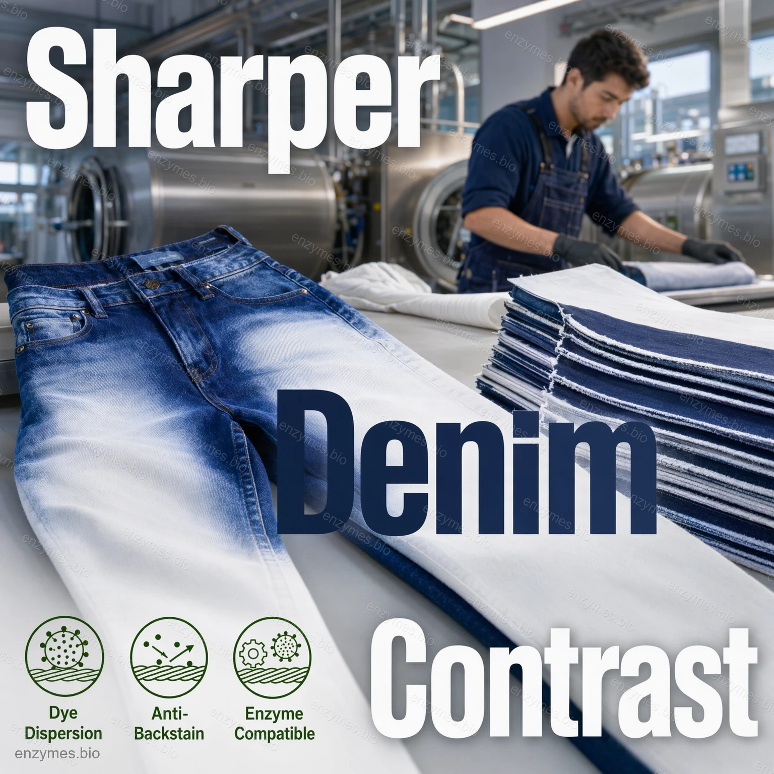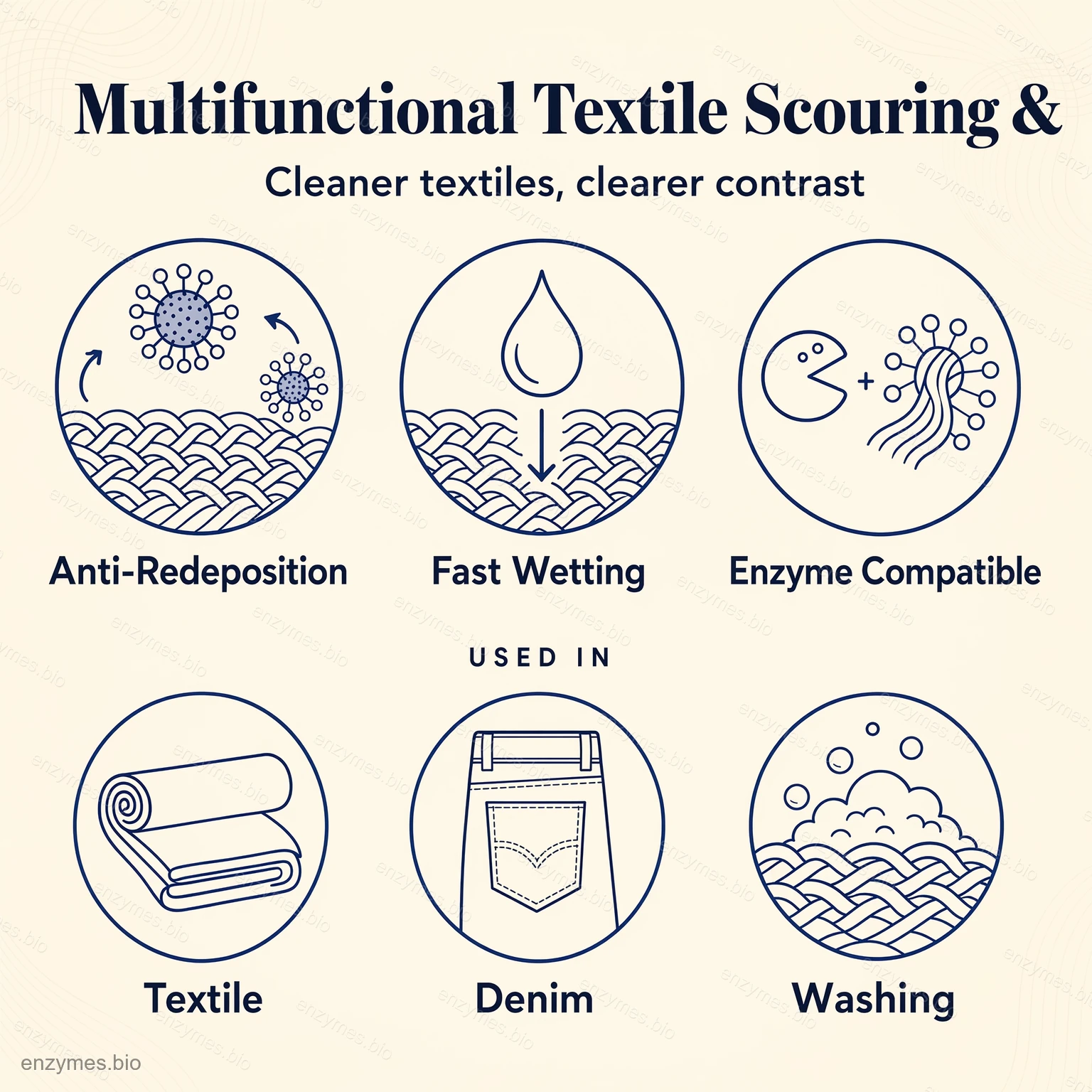 La formulation est entièrement compatible avec la cellulase et d'autres enzymes textiles. Lorsqu'elle est appliquée dans des systèmes de lavage ou de décapage assistés par des enzymes, elle améliore l'efficacité globale du lavage, renforce le comportement anti-redéposition et favorise un aspect plus net du tissu sans endommager les fibres.