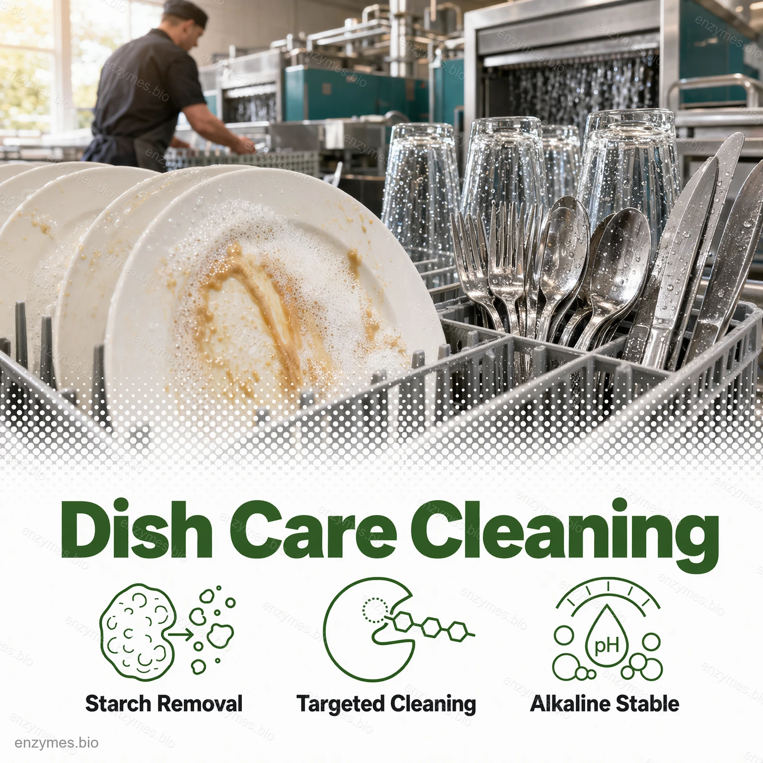 L'amylase dégrade l'amidon en dextrine hydrosoluble, en oligosaccharides et enfin en glucose, ce qui permet de solubiliser et d'éliminer les taches d'amidon.
