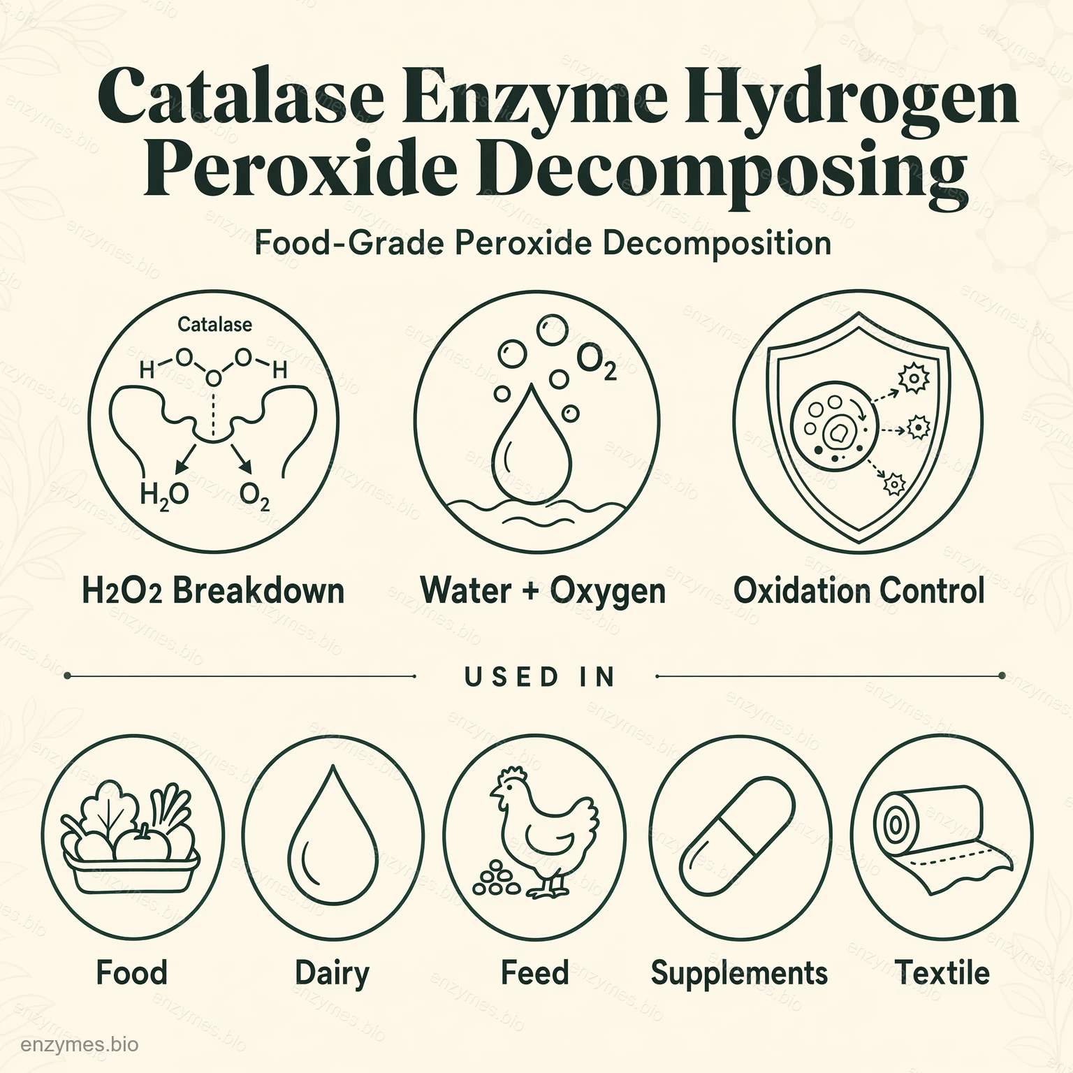- Transformation des aliments : Certains aliments contiennent du peroxyde d'hydrogène, un oxydant puissant, qui peut laisser des résidus toxiques de peroxyde d'hydrogène dans les aliments. La catalase peut aider à éliminer ces résidus.
