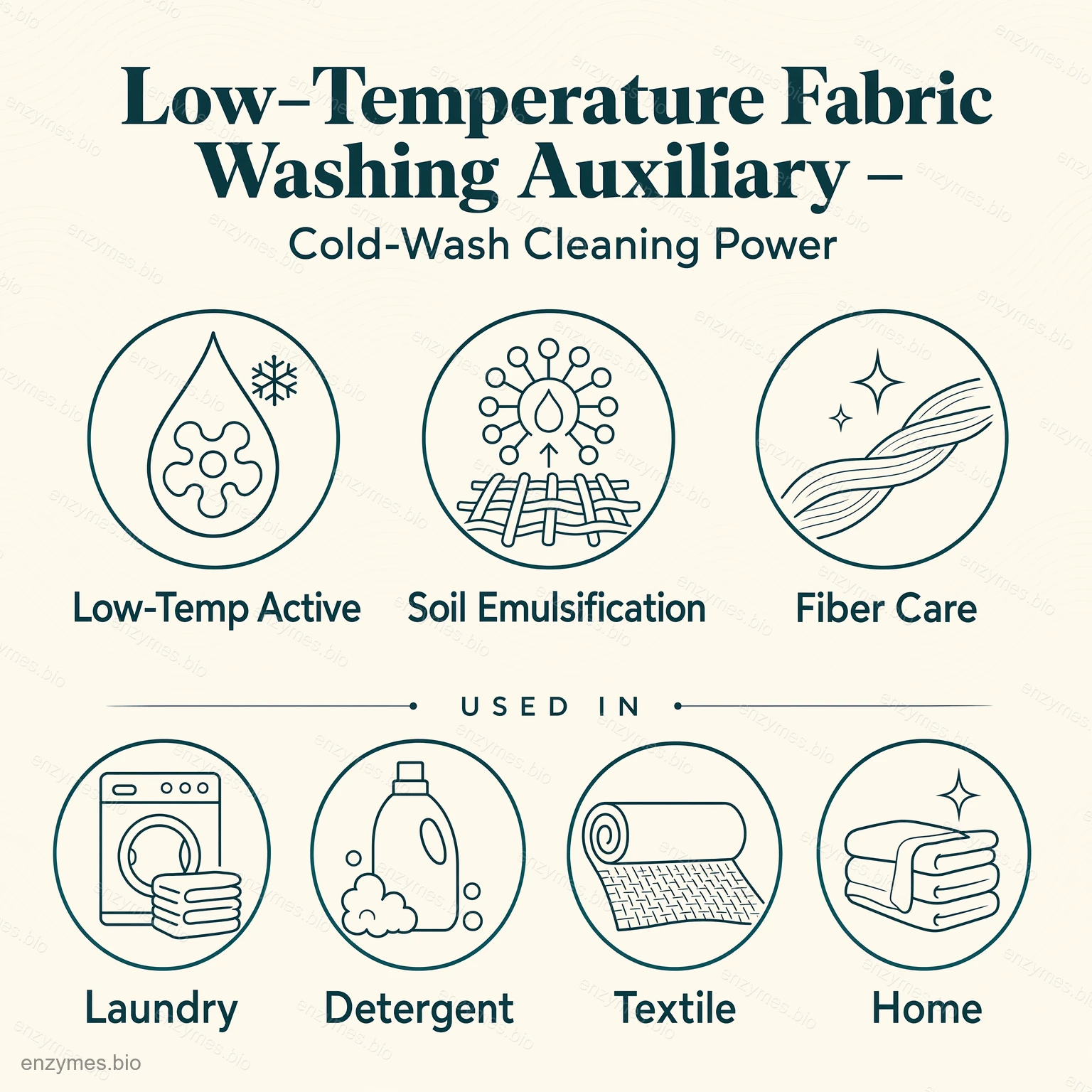 Alacsony hőmérsékletű szövetmosó segédanyag az új generációs, öko-hatékony mosószer-összetevőket képviseli, amely az enzimtechnológiát és a felületaktív anyagok kémiai tulajdonságait ötvözi, hogy kiváló tisztaságot, puhaságot és színvédelmet biztosítson, miközben energiát takarít meg és védi a szöveteket.