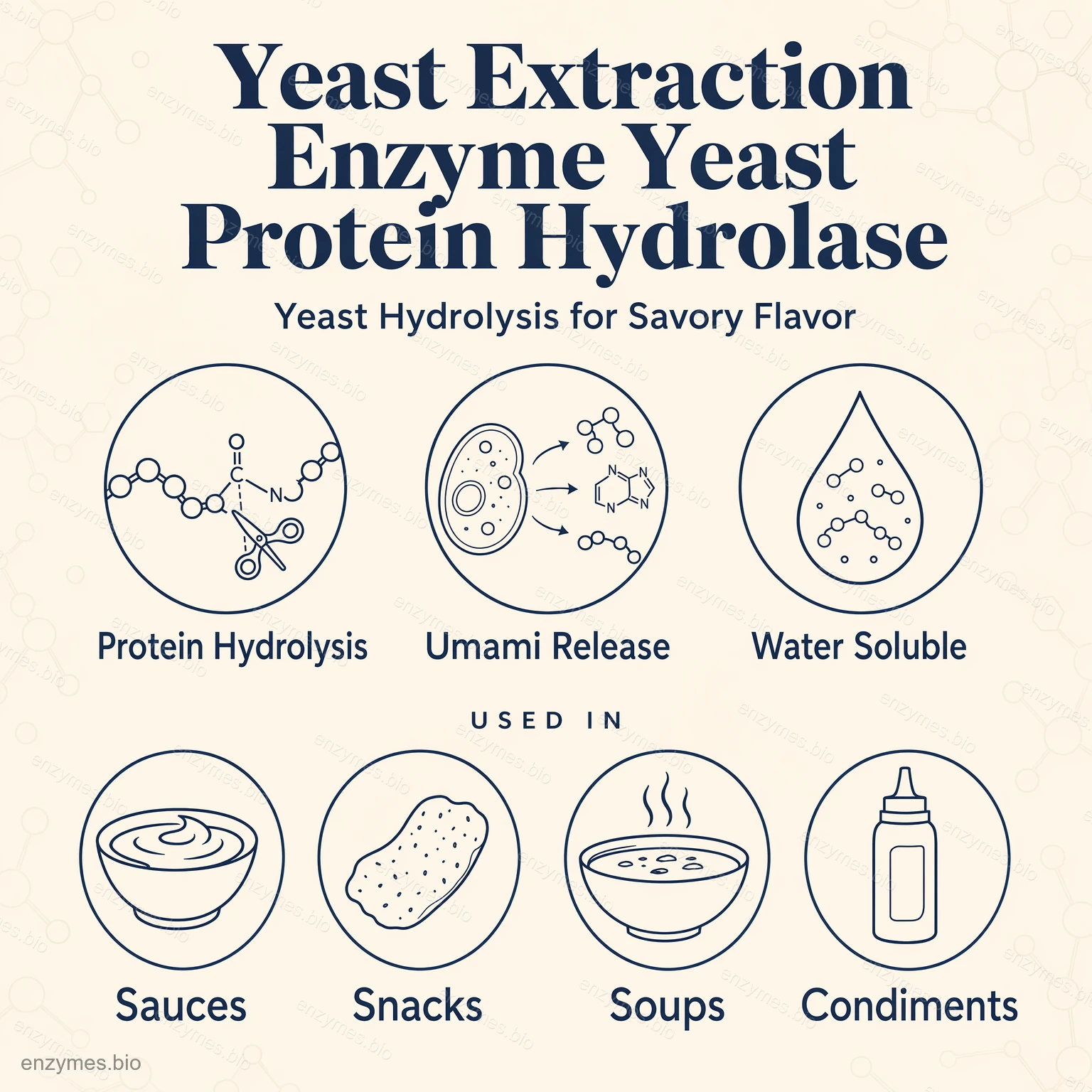 Élesztő extraktáz egy olyan összetett enzim, amelyet az EnzymesBio csoport kifejezetten az élesztő enzimatikus hidrolízisének termelési folyamatjellemzőihez fejlesztett ki. Képes az élesztőfehérjéket aminosavakká, peptidekké, kis molekulájú fehérjékké, nukleotidokká, cukrokká, vitaminokká és ízvegyületekké hidrolizálni.