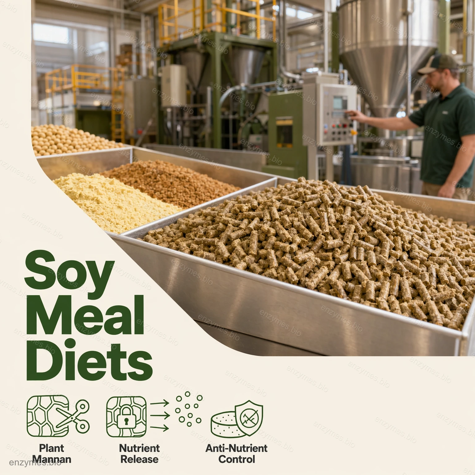 - A takarmányban lévő mannán lebontása, a mannán táplálkozásellenes tényezőinek kiküszöbölése és a takarmány emészthetőségének növelése.