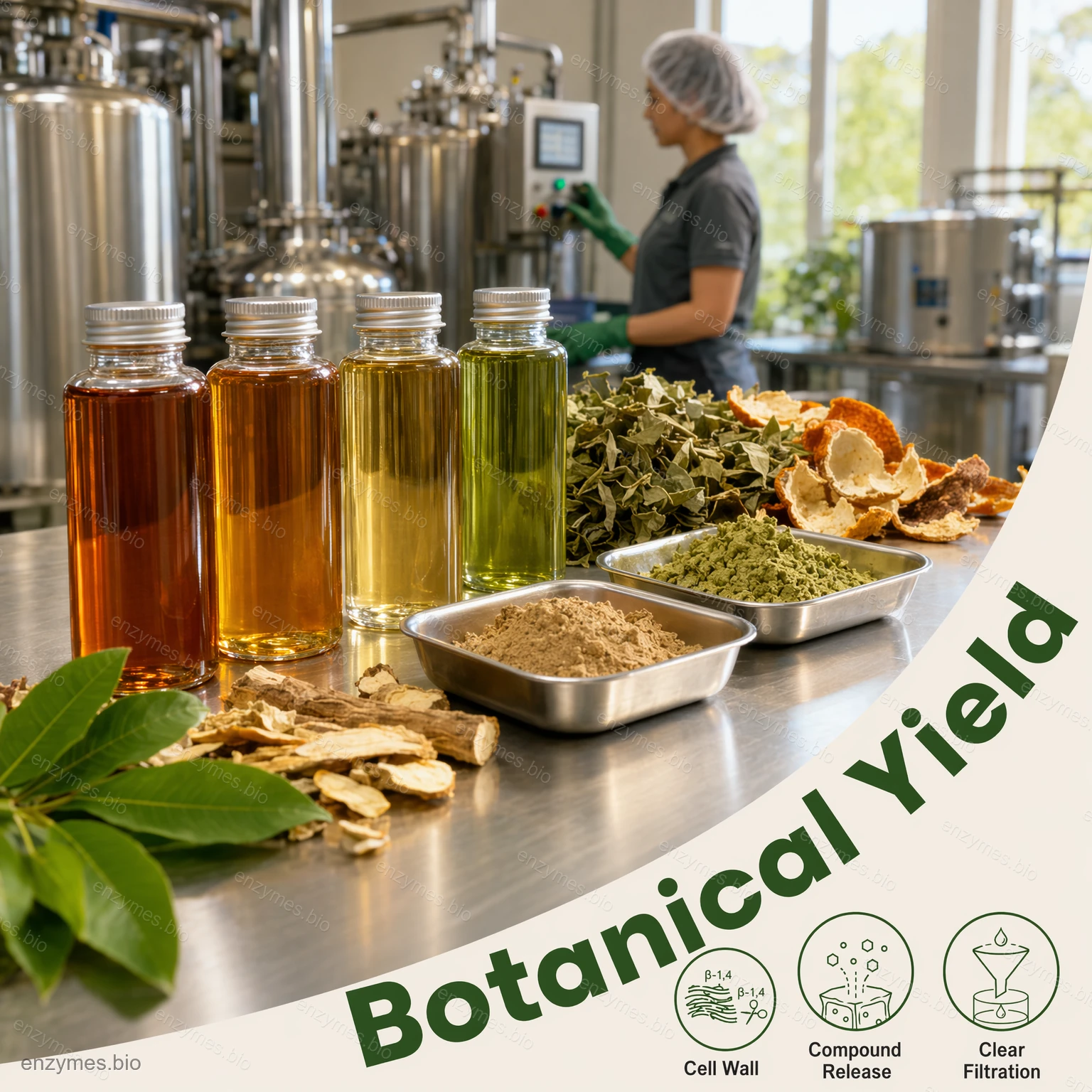 Proses ekstraksi botani yang dibantu enzim umumnya dimulai dengan bahan tanaman mentah, yang pertama-tama dihancurkan dan kemudian diekstraksi dengan air. Selama tahap ekstraksi air, enzim cellulase dapat ditambahkan untuk mempercepat pemecahan dinding sel tanaman dan meningkatkan pelepasan senyawa intraseluler. Setelah ekstraksi air, enzim tambahan seperti pectinase, amylase, atau protease dapat ditambahkan sesuai kebutuhan proses, yang lebih lanjut meningkatkan pelarutan bahan aktif dan meningkatkan kejernihan.