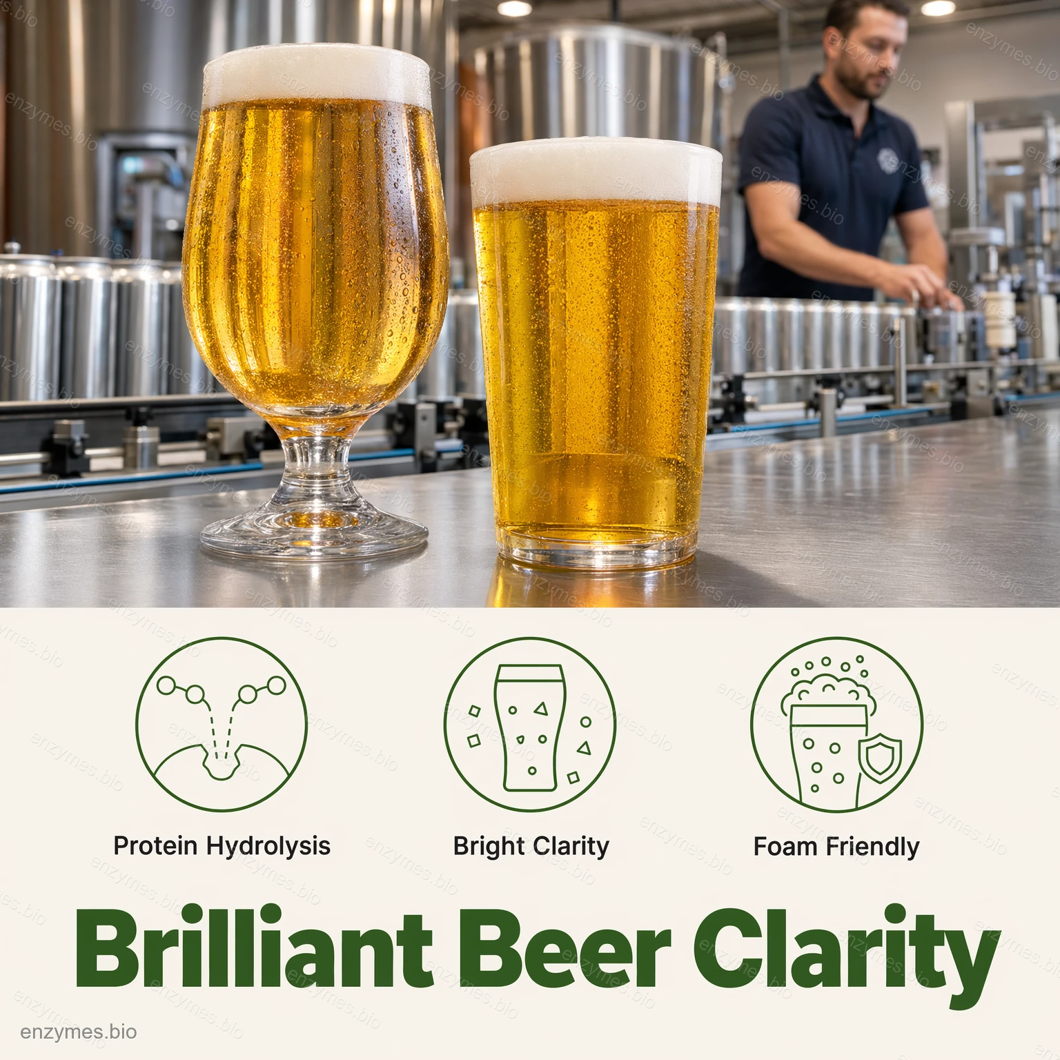 Questo prodotto è un proteasi di grado alimentare sviluppato specificamente per la industria della birra. È ampiamente utilizzato come additivo enzimatico liquido per favorire la limpidezza della birra, la stabilità al freddo e la qualità visiva complessiva durante la produzione e la conservazione. Agendo selettivamente sulle proteine che formano la foschia, aiuta a ridurre il rischio di foschia da freddo senza alterare il profilo gustativo originale della birra.