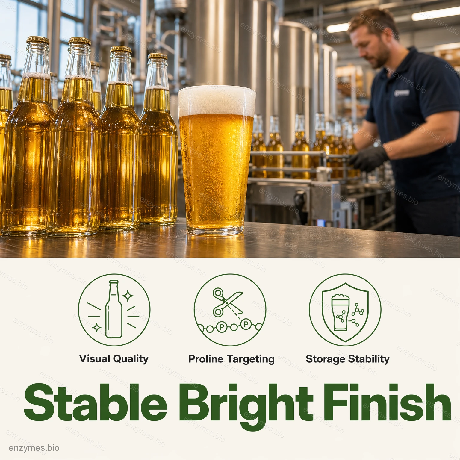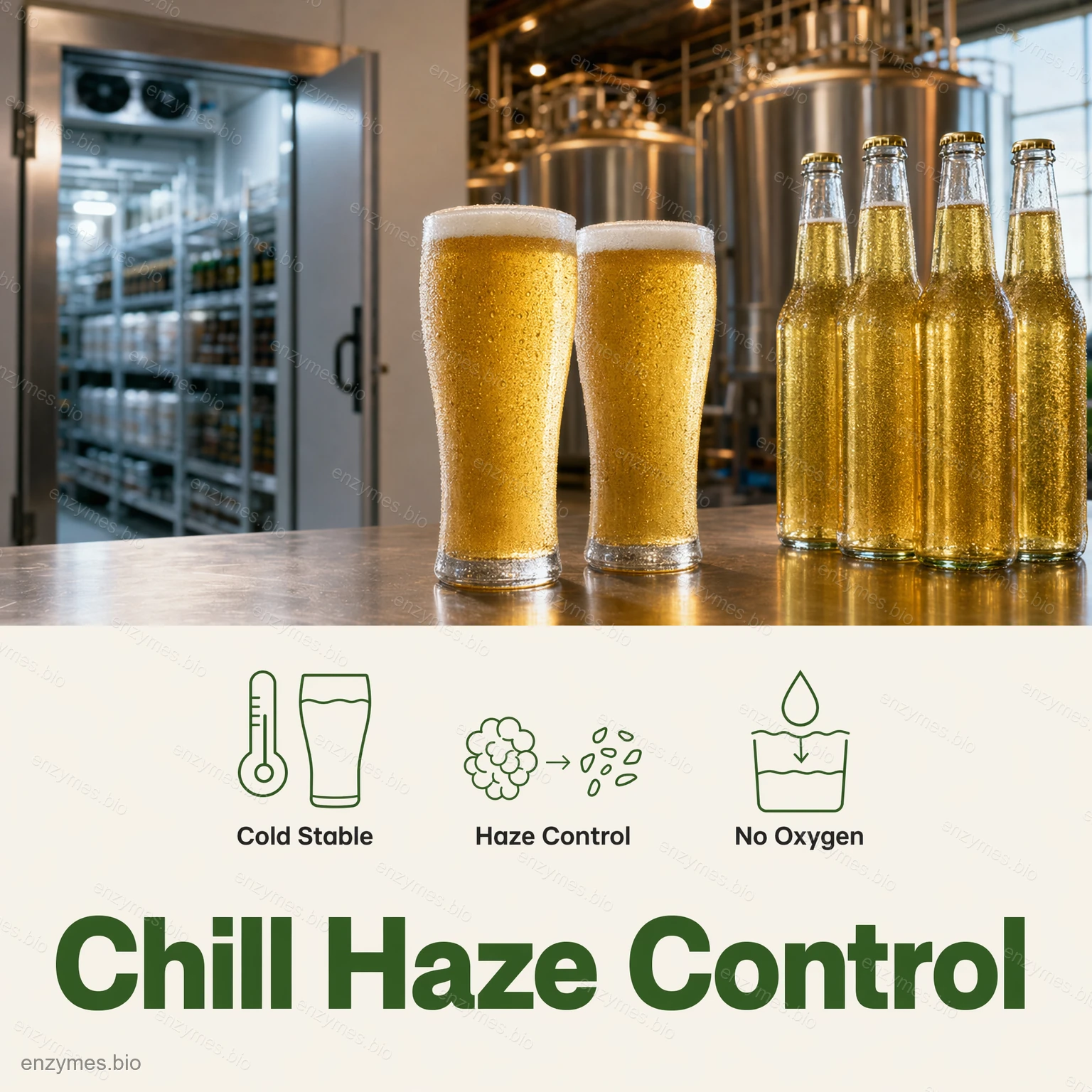 Durante la produzione della birra, alcune frazioni proteiche possono causare la formazione di nebbia da raffreddamento quando la birra è esposta a basse temperature. Questa proteasi agisce scomponendo le proteine che formano la nebbia in frammenti più piccoli e solubili, aiutando a mantenere un aspetto luminoso e stabile durante la conservazione e la distribuzione a freddo. L'azione enzimatica è controllata e mirata, garantendo un impatto negativo sugli attributi sensoriali.