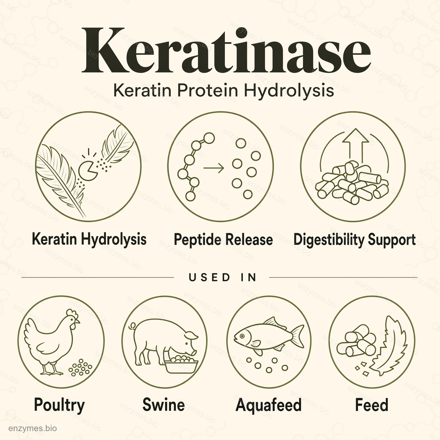 - 農業では微生物ケラチナーゼはケラチンをペプチドとアミノ酸に分解し、有機肥料の製造に使用することができます。