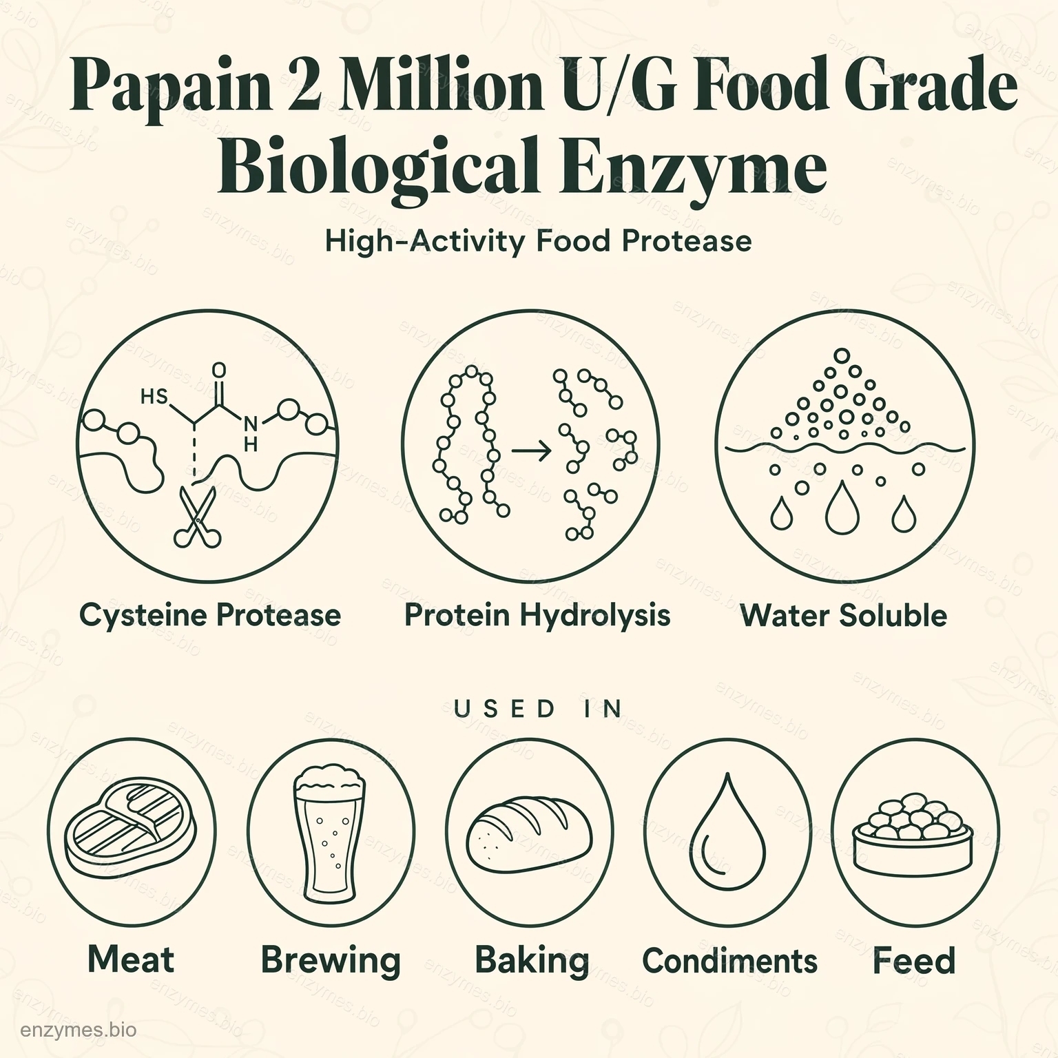 パパインは、バイオエンジニアリング技術によりパパイヤの未熟果肉から抽出された天然の生物学的酵素製剤です。パパイン、パパイヤレンネットA、パパイヤレンネットB、パパイヤペプチダーゼB、その他のタンパク質分解酵素から主に構成されています。パパインは212個のアミノ酸で構成され、分子量は27000です。