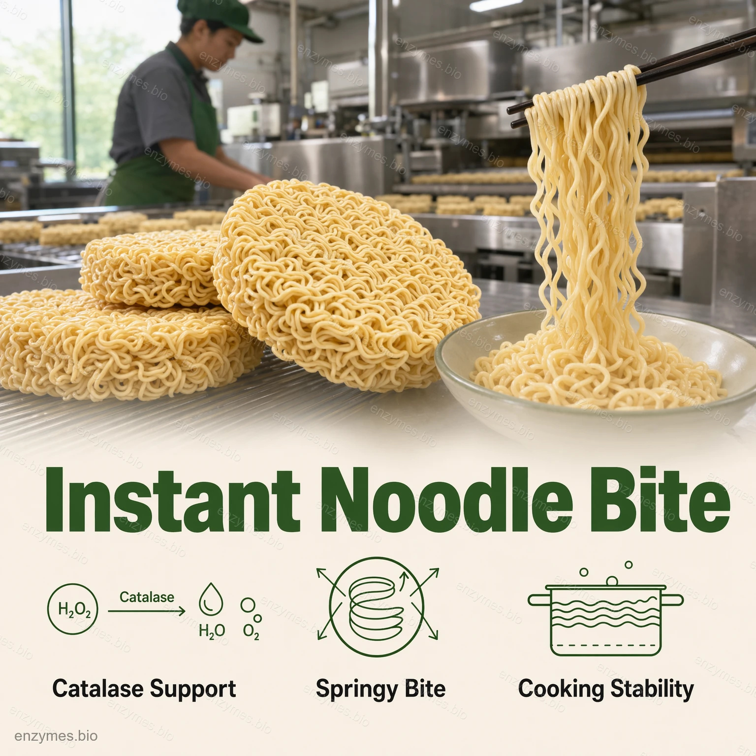 本品は、 複合システム 麺の加工において一般的に使用される機能性酵素を含み、例えば: グルコースオキシダーゼ, リパーゼ、 そして カタラーゼ, 食品グレードのキャリアでサポートされています。各成分は相乗的に作用するよう選定されており、一貫した加工性能と最終的な食感の向上を実現します。.
