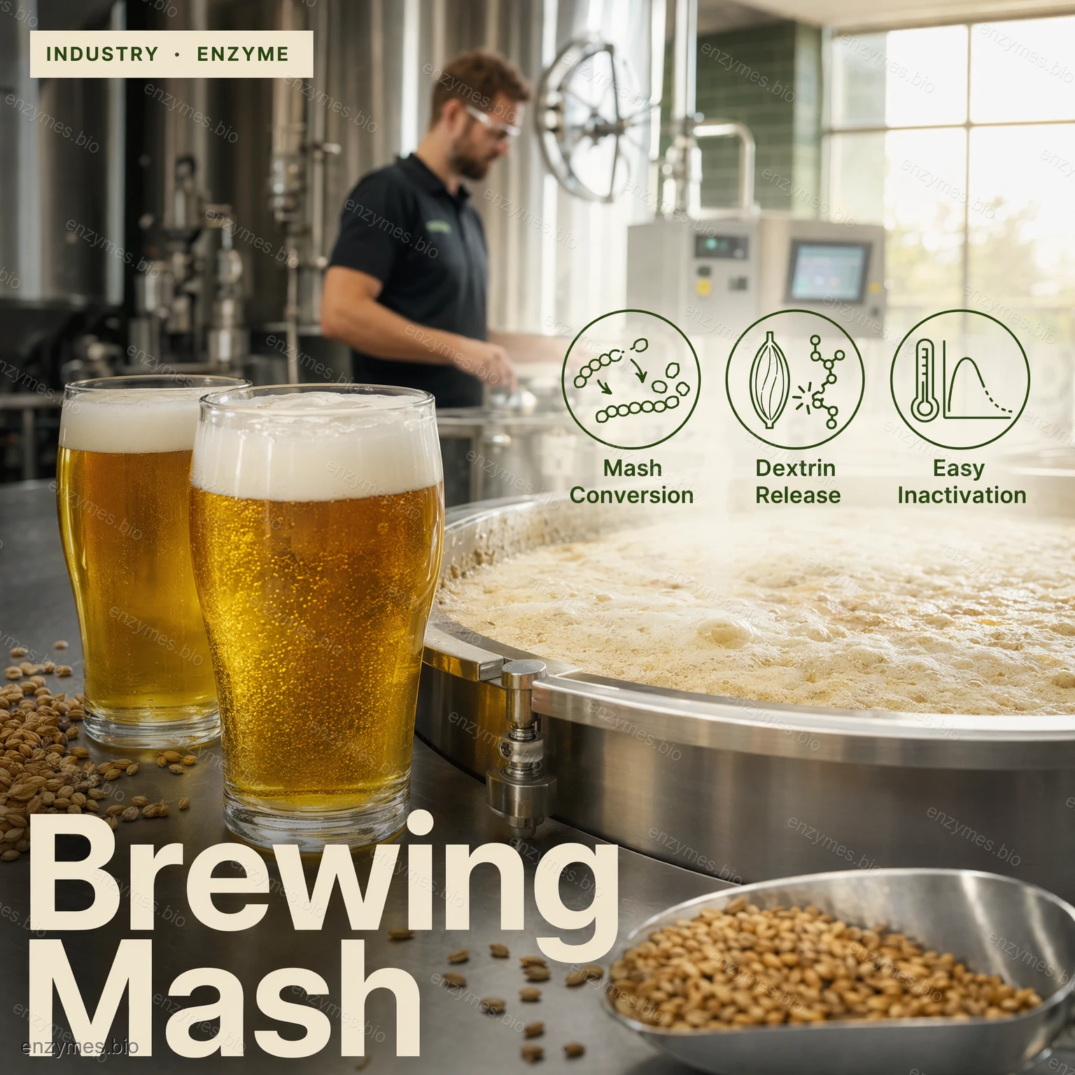 - 맥주 양조 산업: 권장 사용량은 총 원료 1톤당 효소 제제 0.4~0.8리터이며, 당화 과정에 첨가합니다.