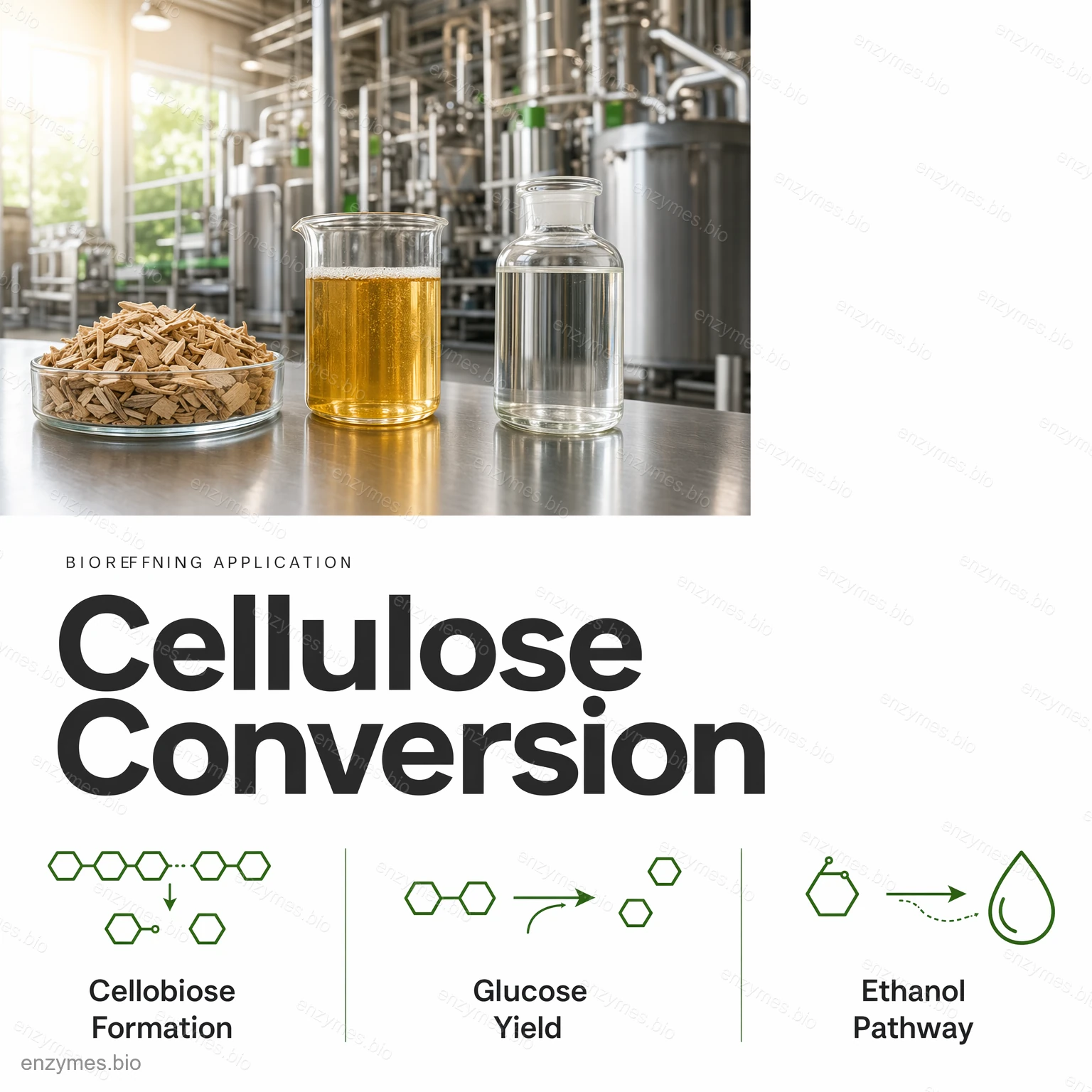 Celuloze ir glikozes polimērs, kas saistīts ar β-1,4-glikozīdu saitēm. Celulāzes sistēma sastāv no trim galvenajiem komponentiem: endoglukanāze (endo-1,4-β-D-glikanāze vai EG), celobiohidrolāzes (ekso-1,4-β-D-glikanāzes jeb CX, vai CBH) un β-glikozidāzes (1,4-β-D-glikozidāze; BG; BGL). Kā parādīts zemāk esošajā diagrammā, šīs darbības sinerģiski darbojas uz celulozi un efektīvi pārvērš celulozi glikozē.