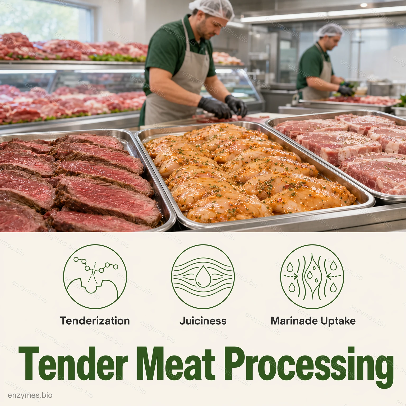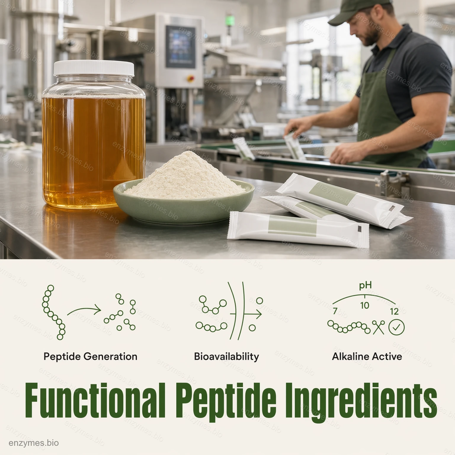 Šis enzīms efektīvi sadala peptīdu saites lielās proteīnu molekulās, sadalot tās mazākās peptīdos un brīvās aminoskābēs. Šis process uzlabo produkta garšu, mīkstumu, palielina mitruma saglabāšanu un ievērojami paaugstina proteīnu kopējo bioloģisko pieejamību un funkcionālo veiktspēju. Tas izskatās kā gaiši dzeltens līdz dzintara krāsas šķidrums ar izcilu šķīdību un stabilitāti, padarot to piemērotu modernām pārtikas pārstrādes vidēm.
