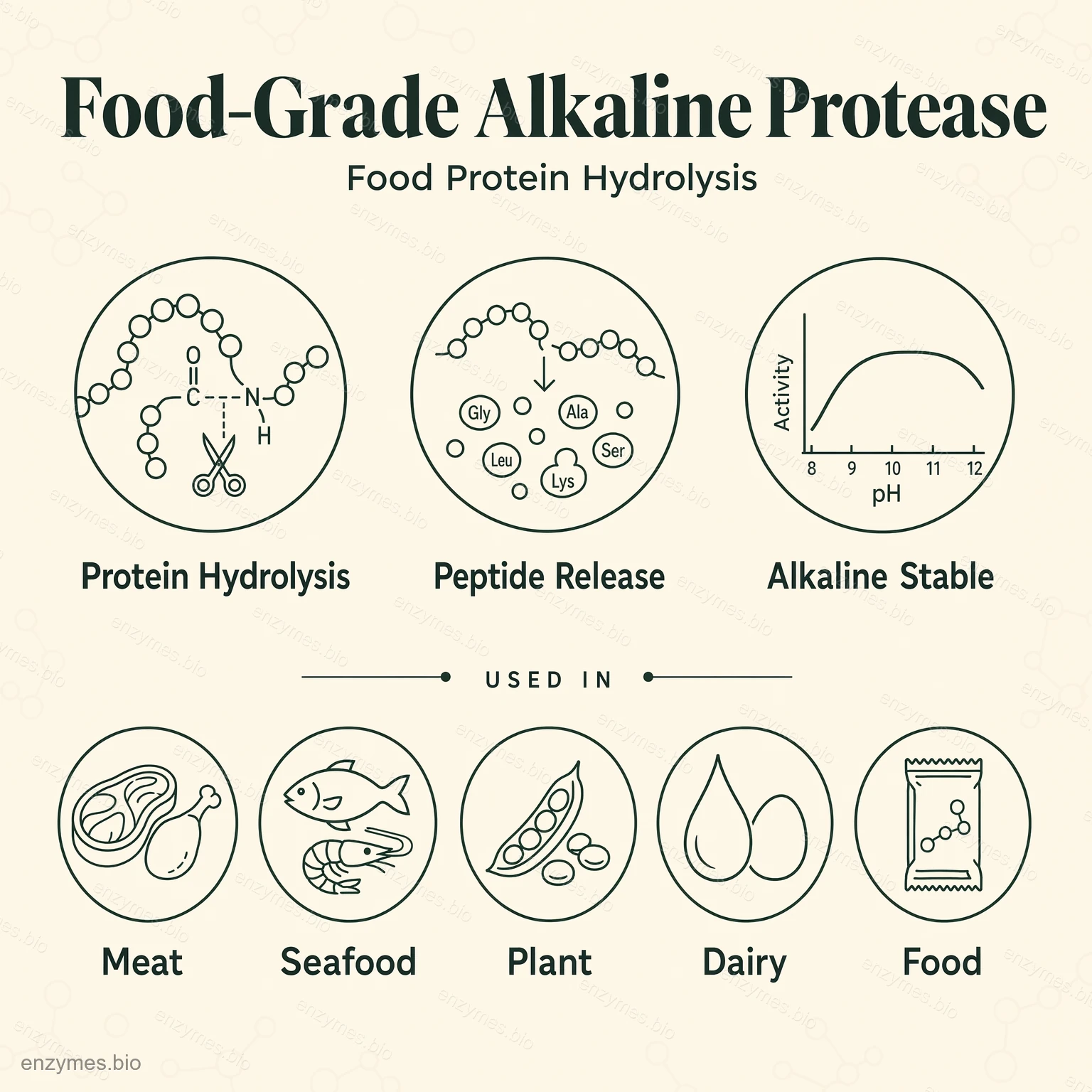 Pārtikas kvalitātes sārmainā proteāze ir ļoti efektīva serīna proteāze, kas paredzēta plaša spektra pārtikas proteīnu hidrolīzei un modifikācijai. Tā ir plaši izmantojama gaļas pārstrādē, jūras velšu pārstrādē, olu proteīnu hidrolīzē, funkcionālo peptīdu ražošanā un augu proteīnu modifikācijā, jo tai ir spēcīga katalītiskā aktivitāte un lieliska saderība ar dažādiem substrātiem.