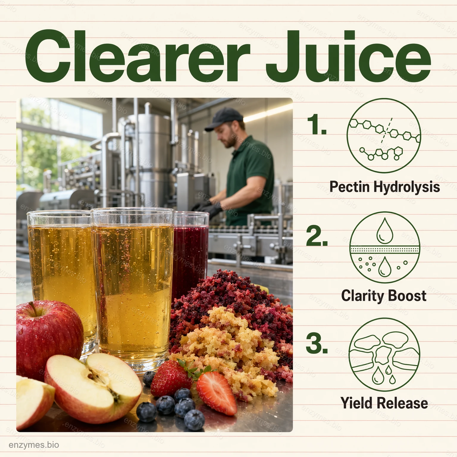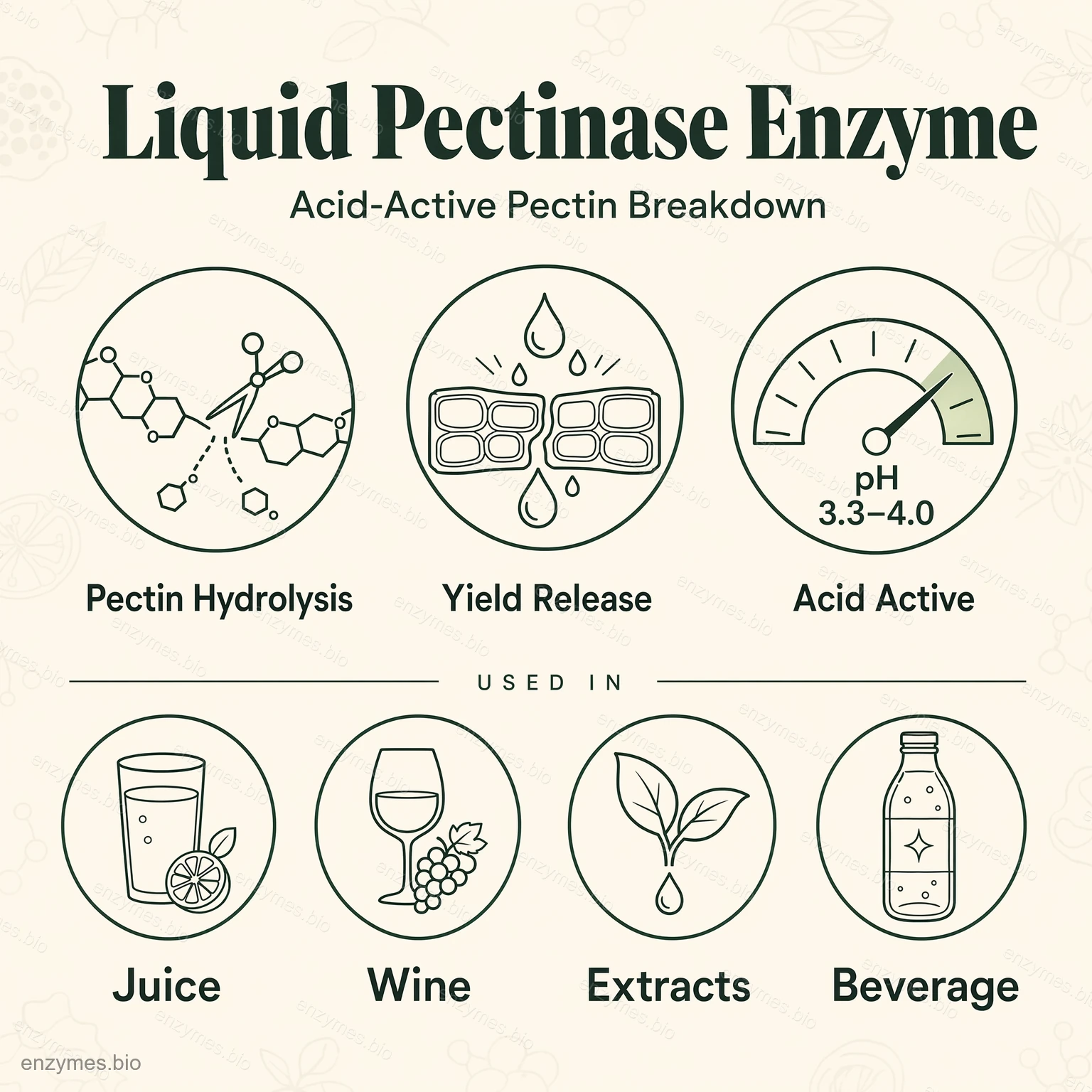 Lai nodrošinātu efektīvu pektīna noārdīšanu, produktā ir iesaistītas dažādu veidu pektināzes (PG, PE un PL). Turklāt tajā esošā celulāze un hemicelulāze palīdz noņemt pektīna mugurkaula sānu ķēdes un vislielākajā mērā depolimerizē pektīnu, kas ir ļoti noderīgi sulas dzidrināšanai un augu šūnu sadalīšanai, atbrīvojot sulā vērtīgas sastāvdaļas.