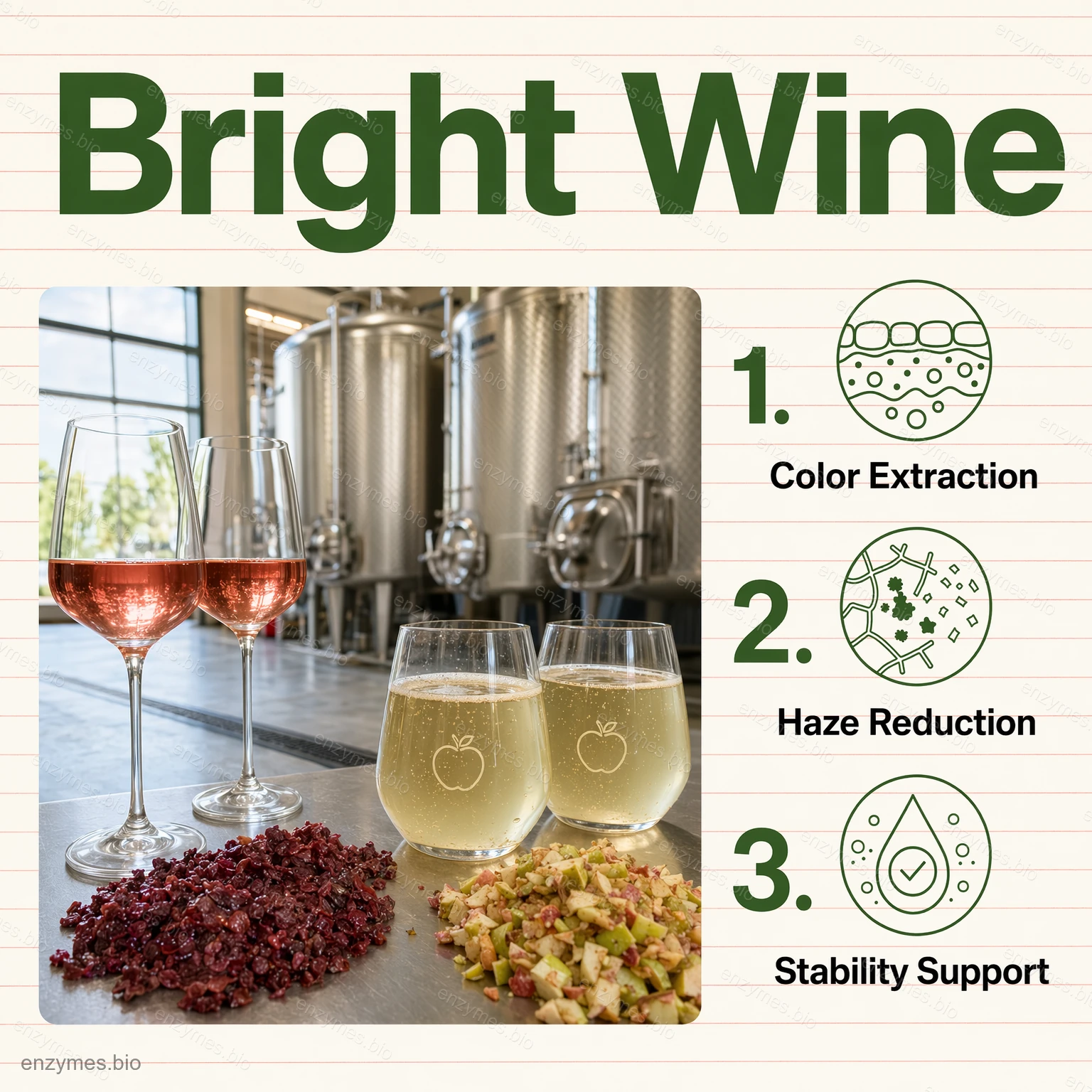 - Vīns / sidrs: lielāka raža, lielāka krāsas ekstrakcija un labāka vīna dzidrināšana vai stabilizācija.