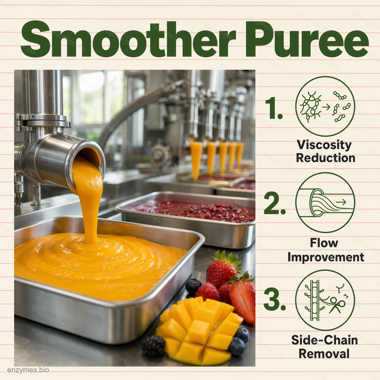 - Augļu un dārzeņu pārstrāde: sulas iznākuma palielināšana un sulas dzidrināšana; vajadzības gadījumā - viskozitātes samazināšana biezeņa vai augļu pulvera pagatavošanai.