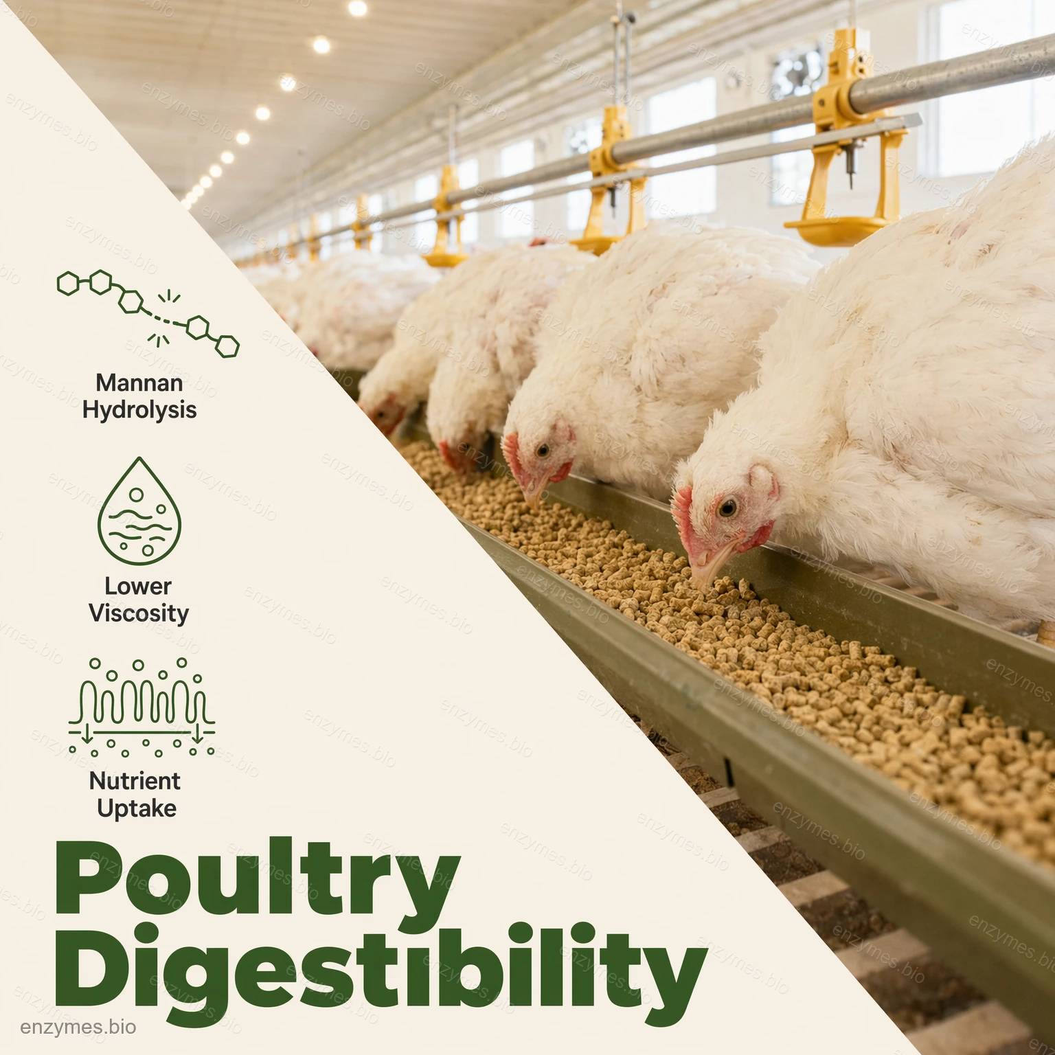 - Nedbryter mannan i fôringredienser og eliminerer den anti-næringsmessige effekten av mannan, noe som øker fordøyeligheten av fôret.