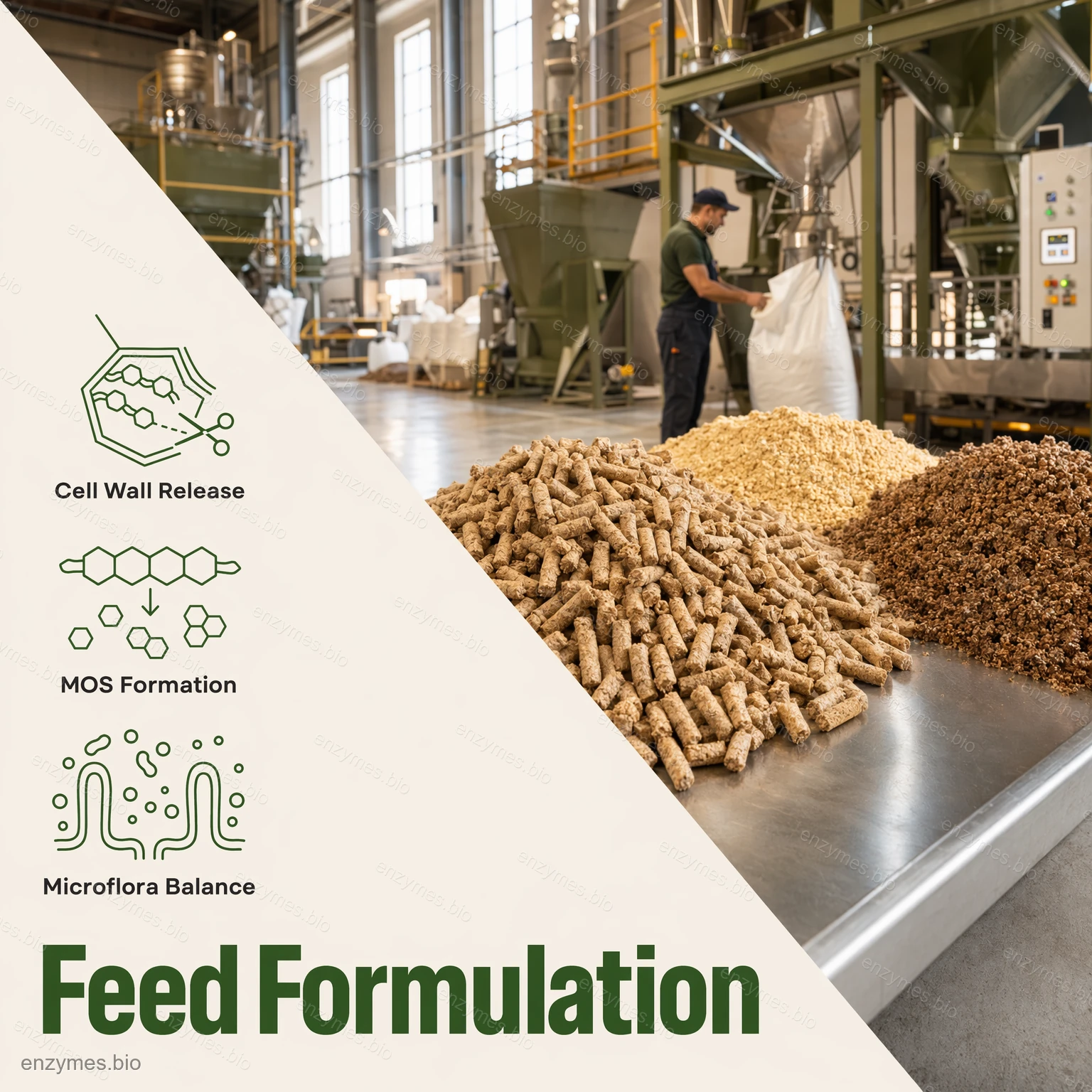 - Ødelegger celleveggstrukturen i plantefôr, frigjør næringsstoffene og øker fordøyelsen og utnyttelsen av næringsstoffene.