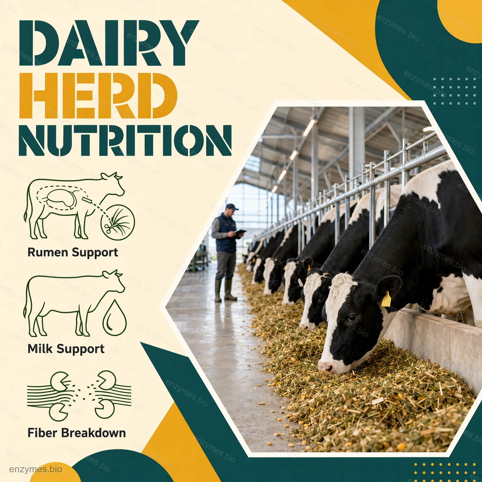 Dette produktet er et enzymkompleks som inkluderer cellulase, xylanase, β-glukanase, mannanase og så videre. Det ble optimalisert for melkekyr basert på fordøyelsesmekanismen i vomma, den ernæringsmessige sammensetningen av TMR og fôringsforsøk på forskjellige gårder. Produktet kan fremme melkeytelsen til melkekyr, øke melkeytelsen og forbedre melkekvaliteten.