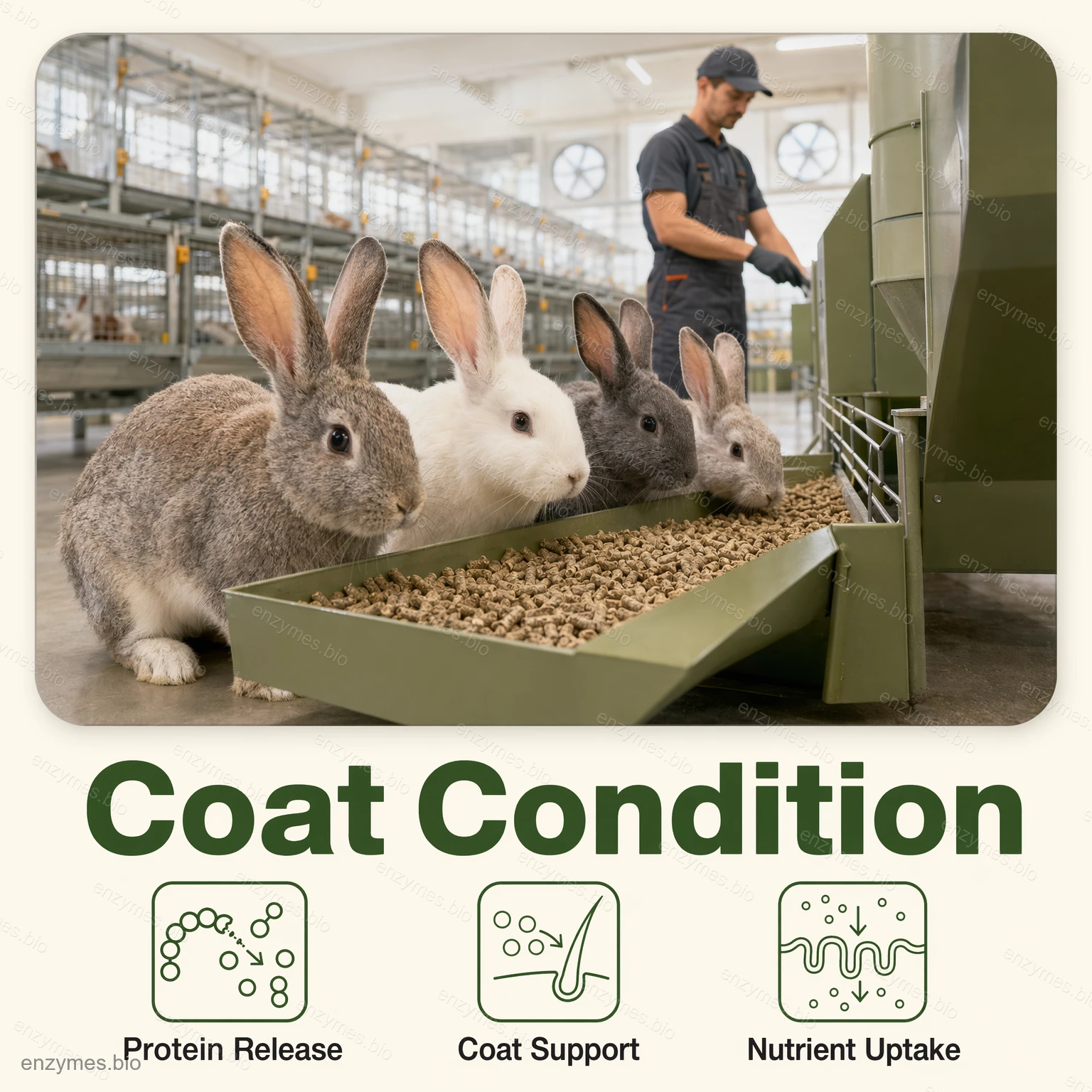 Det nøye balanserte enzymsystemet virker synergistisk for å bryte ned komplekse plantematerialer til lett absorberbare næringsstoffer. Denne virkningen avlaster fordøyelsessystemet i kaninens mage-tarmkanal, minimerer næringsstoffsvinn og stabiliserer tarmfermenteringen. Som et resultat oppnår kaniner bedre fôrkonvertering, sunnere tarmmiljø og forbedret total produktivitet.