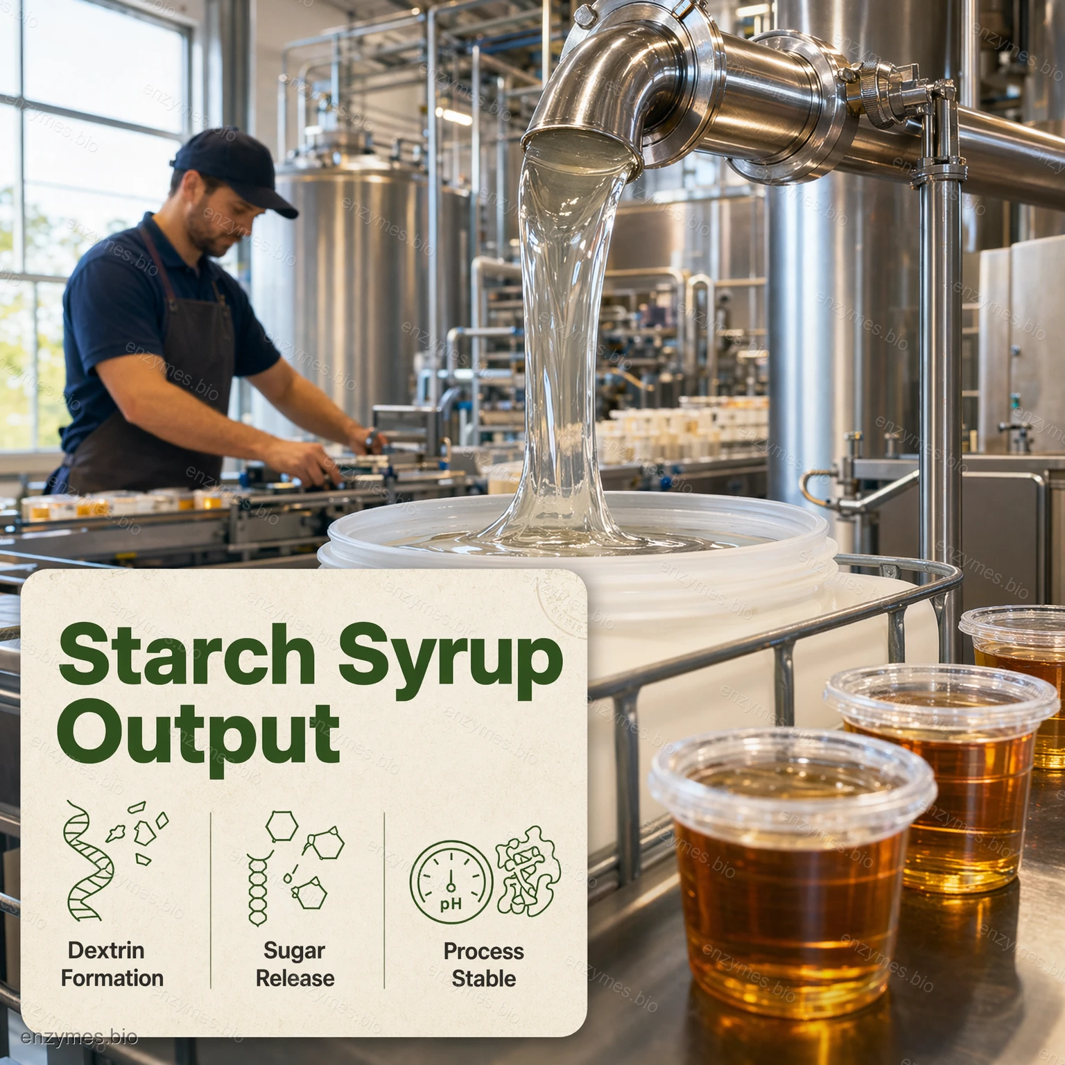 Stivelses- og sukkerindustrien: Anbefalt påføringsmengde er 0,5–1,0 l per tonn tørr stivelse ved sakkarifisering ved 60–63 ℃ og pH 4,3–4,5.