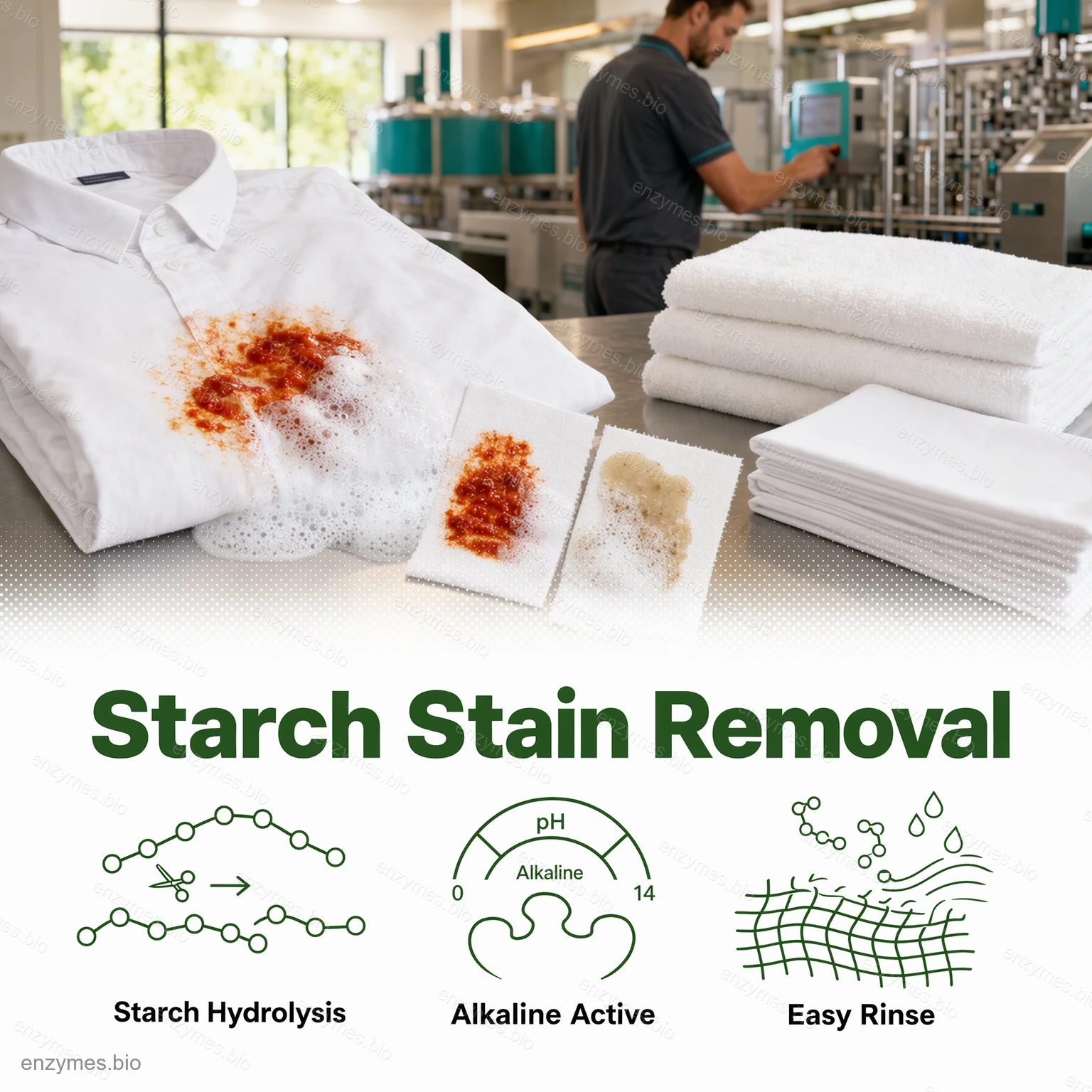 De amylase breekt zetmeel af tot in water oplosbare dextrine, oligosachariden en uiteindelijk glucose, waardoor de zetmeelvlekken opgelost en verwijderd worden.