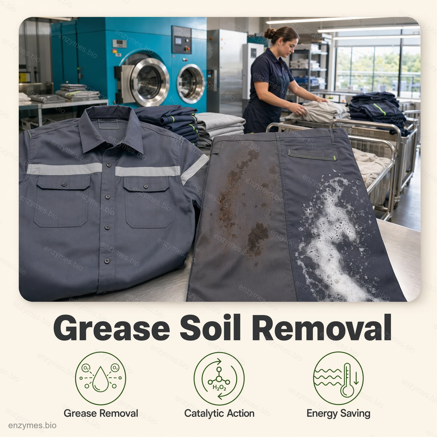 Dit product is een professioneel vloeibaar enzymadditief dat speciaal ontwikkeld is voor commerciële hoofdwasprocessen. Commercial laundry cold bleaching enzyme is een nieuwe generatie zuurstofbleek-enzymactivator bij lage temperatuur. Door gebruik te maken van een gespecialiseerd katalytisch enzym om oxidatiemiddelen te activeren, reageert het in water van 15-55°C om actieve zuurstof af te breken en vrij te geven, waardoor energie wordt bespaard, zeer efficiënt gebleekt wordt en veilige wasresultaten worden behaald.