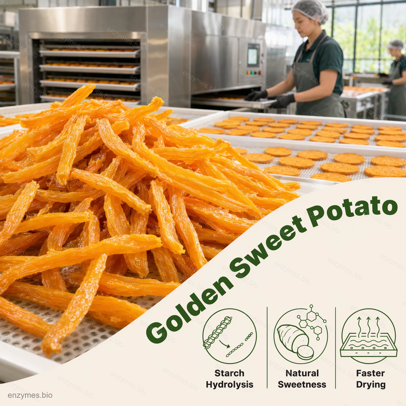 Het gebruik van α-amylase tijdens het drogen van zoete aardappelen verhoogt de zoetheid aanzienlijk, verbetert de vochtverdeling en produceert een Zacht, natuurlijk zoet en goudkleurig product.. Het is een krachtig hulpmiddel voor voedselverwerkers die de kwaliteit en efficiëntie van producten op basis van zoete aardappel willen verbeteren.