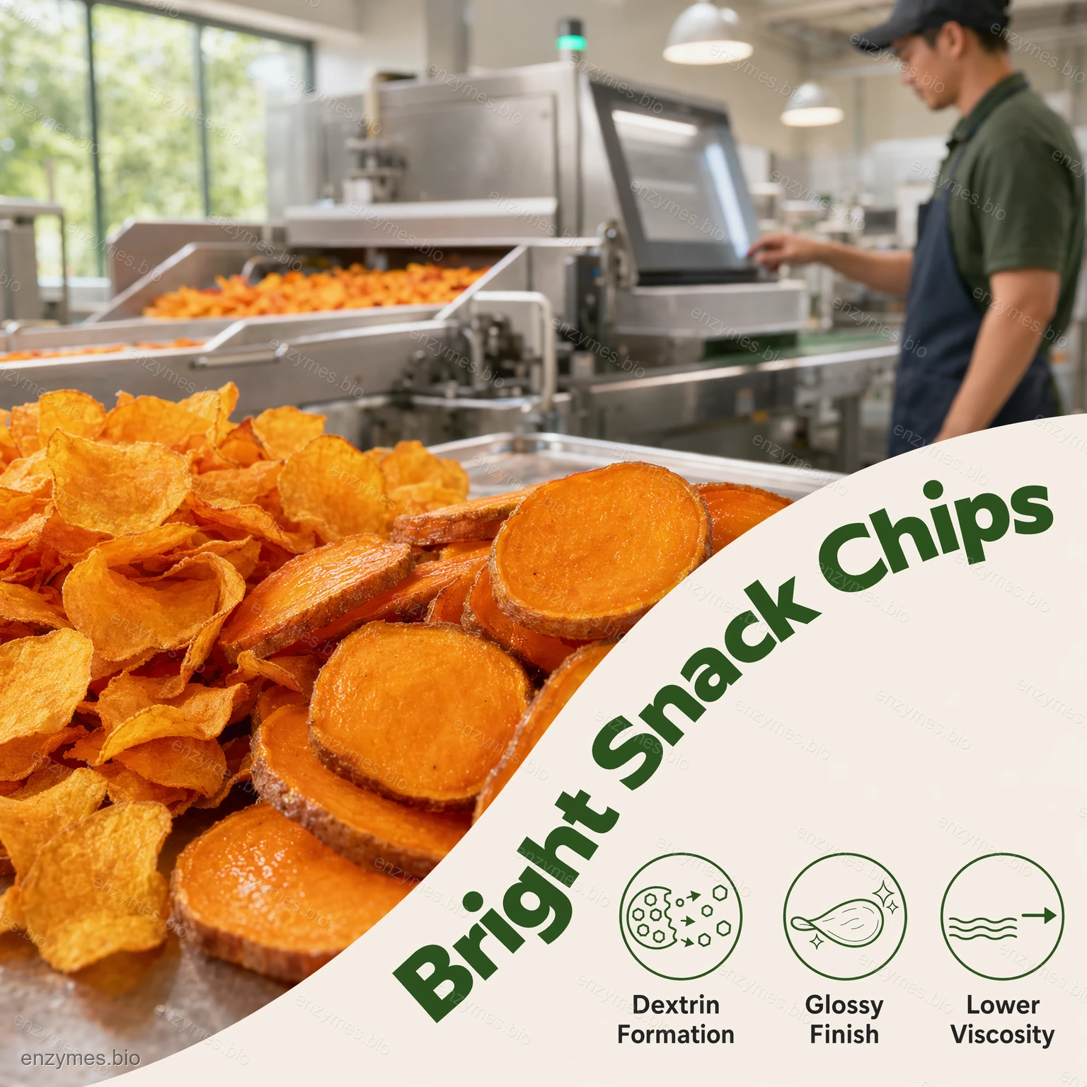α-Amylase (speciaal voor zoete aardappel) is een zeer actief enzympreparaat dat speciaal is ontwikkeld om de verwerking van zoete aardappelen en yams te verbeteren. Dit enzym katalyseert de hydrolyse van zetmeel tot kortere ketens van dextrines en suikers, waardoor de natuurlijke zoetheid van het eindproduct effectief wordt verhoogd en tegelijkertijd de textuur en de droogefficiëntie worden verbeterd. Het is ideaal voor gebruik bij de productie van gedroogde zoete aardappelreepjes, -plakjes en -chips.