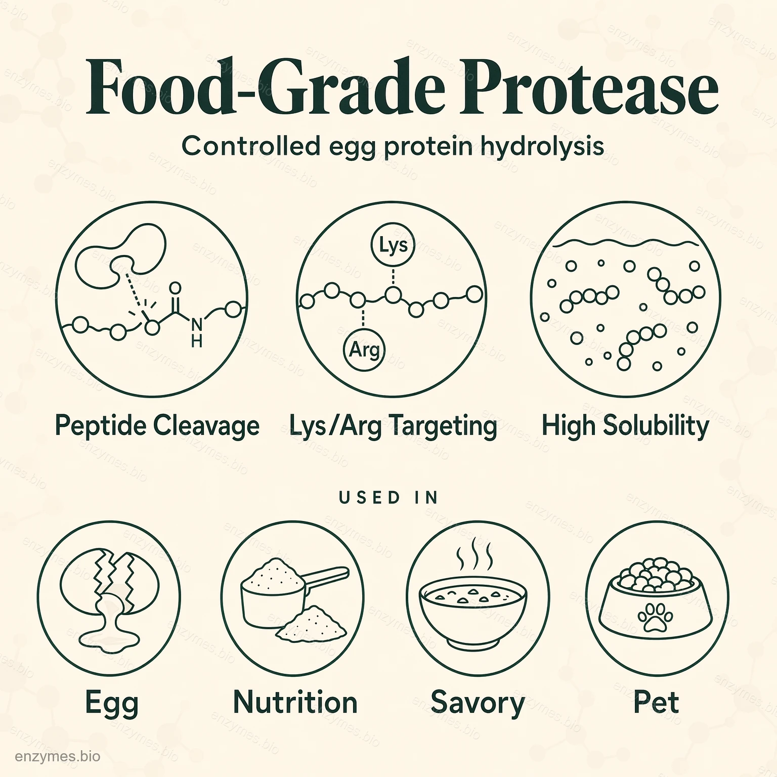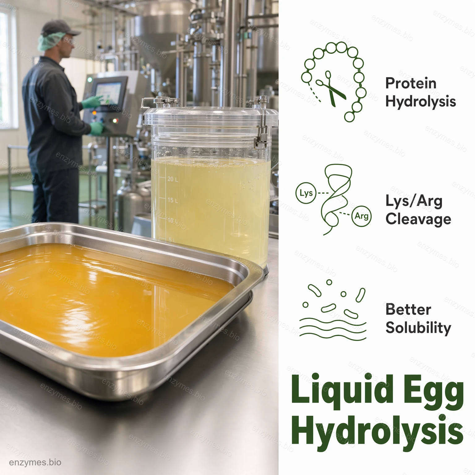 Het protease hydrolyseert selectief peptidebindingen in eiproteïnen, met name die waarbij lysine (Lys) of arginine (Arg) residuen betrokken zijn. Onder geschikte temperatuur- en pH-omstandigheden splitst het grote eiwitmoleculen in kleinere peptidefragmenten en amino-stikstofverbindingen.