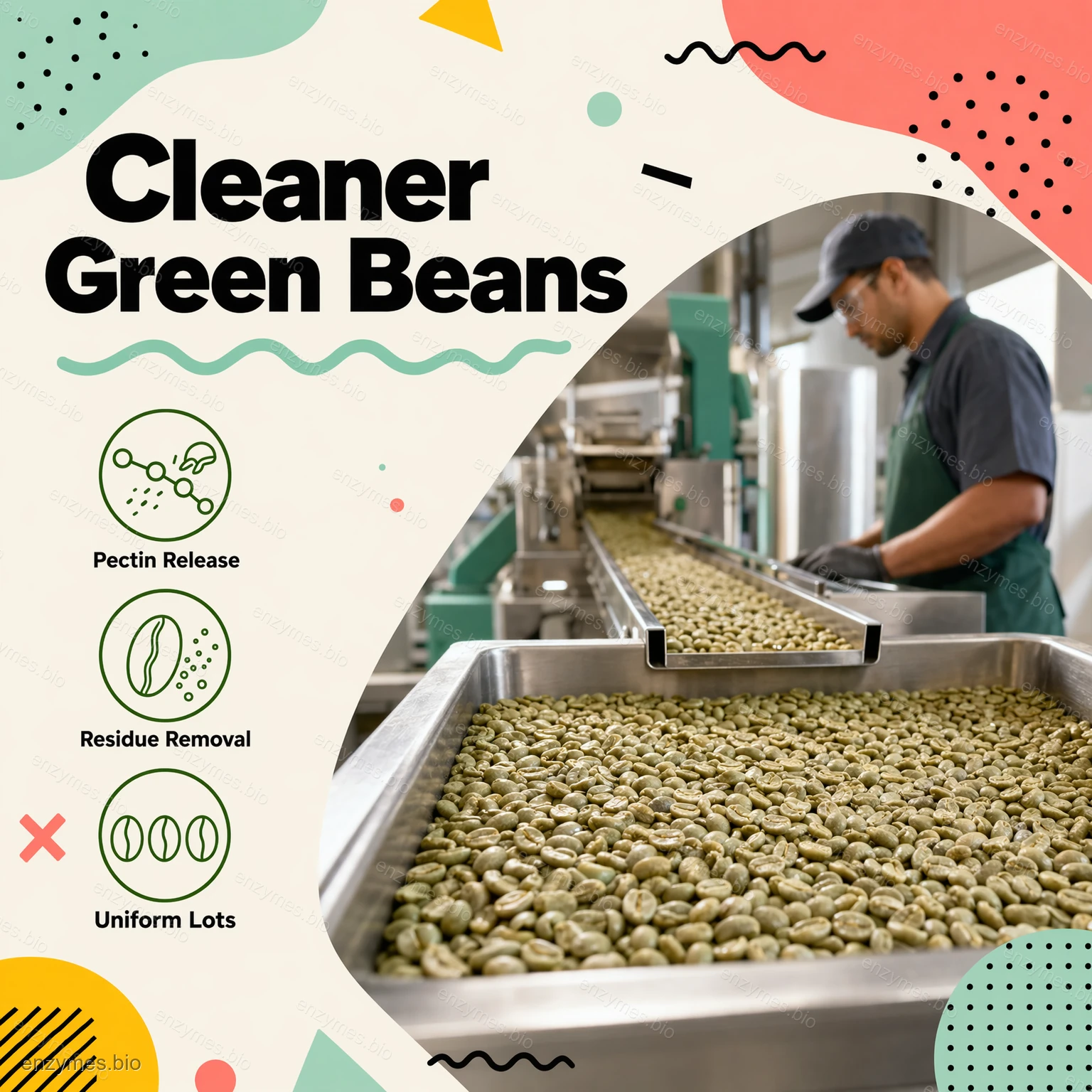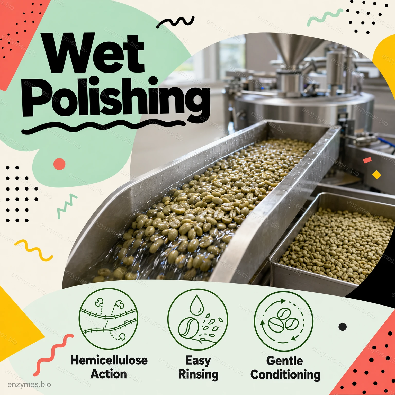 powierzchni. Kiedy enzym z zielonych ziaren kawy jest stosowany w procesie obróbki na bazie wody, jego składniki enzymatyczne hydrolizować polisacharydy związane z powierzchnią które pomagają utrzymać te pozostałości na miejscu. W miarę częściowego rozkładu pektyn, hemiceluloz i powiązanych polimerów zmniejsza się przyczepność między powierzchnią ziarna a pozostałościami. Ułatwia to delikatne mycie, namaczanie, bębnowanie lub polerowanie na mokro w celu oddzielenia i usunięcia tych pozostałości. Rezultatem jest czystsza powierzchnia zielonych ziaren, większa jednolitość partii i lepsza kontrola przygotowania zielonych ziaren kawy do długotrwałego przechowywania i późniejszego palenia.