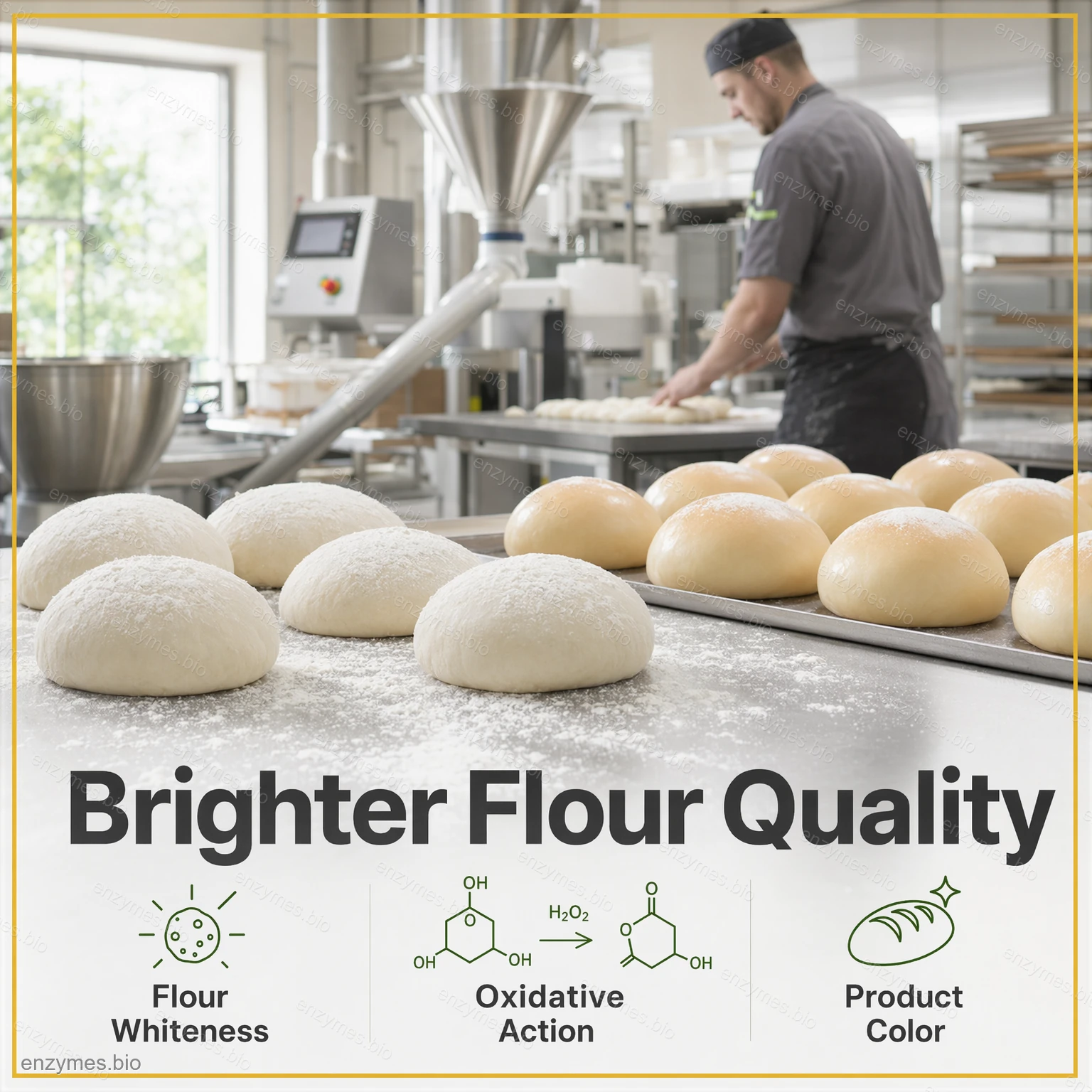Oksydaza glukozy może specyficznie katalizować β-D-glukozę, tworząc kwas glukonowy i nadtlenek wodoru w obecności tlenu, co sprzyja tworzeniu się sieci glutenu, a następnie właściwościom obróbki ciasta i właściwościom sensorycznym wypieków.