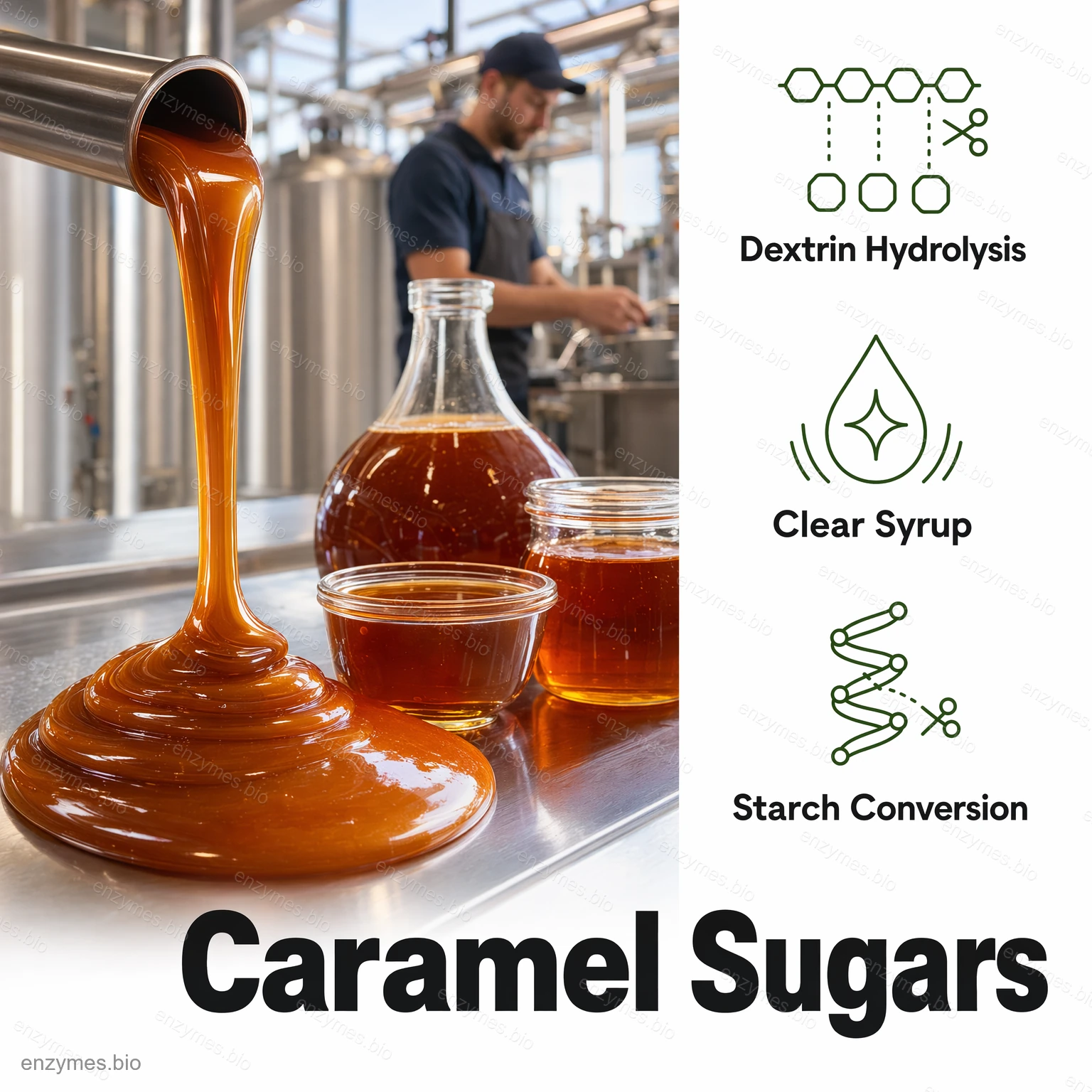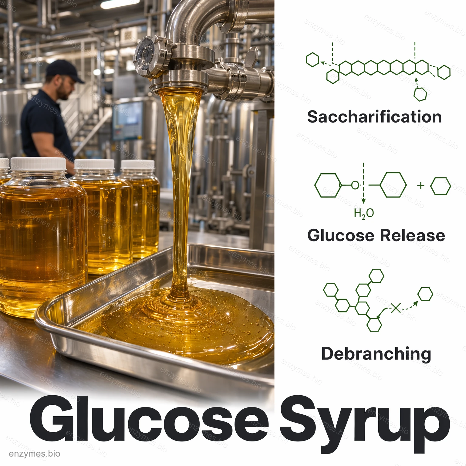 - Producția de zahăr: Glicozilaza poate fi utilizată în procesarea zahărului din amidon pentru a descompune rapid glicozidele a-1,4 ale amidonului și, de asemenea, are un rol activ în legăturile glicozidice a-1,6 și a-1,3, utilizate în mod obișnuit în producerea de glucoză, caramel, fructoză și alte zaharuri.