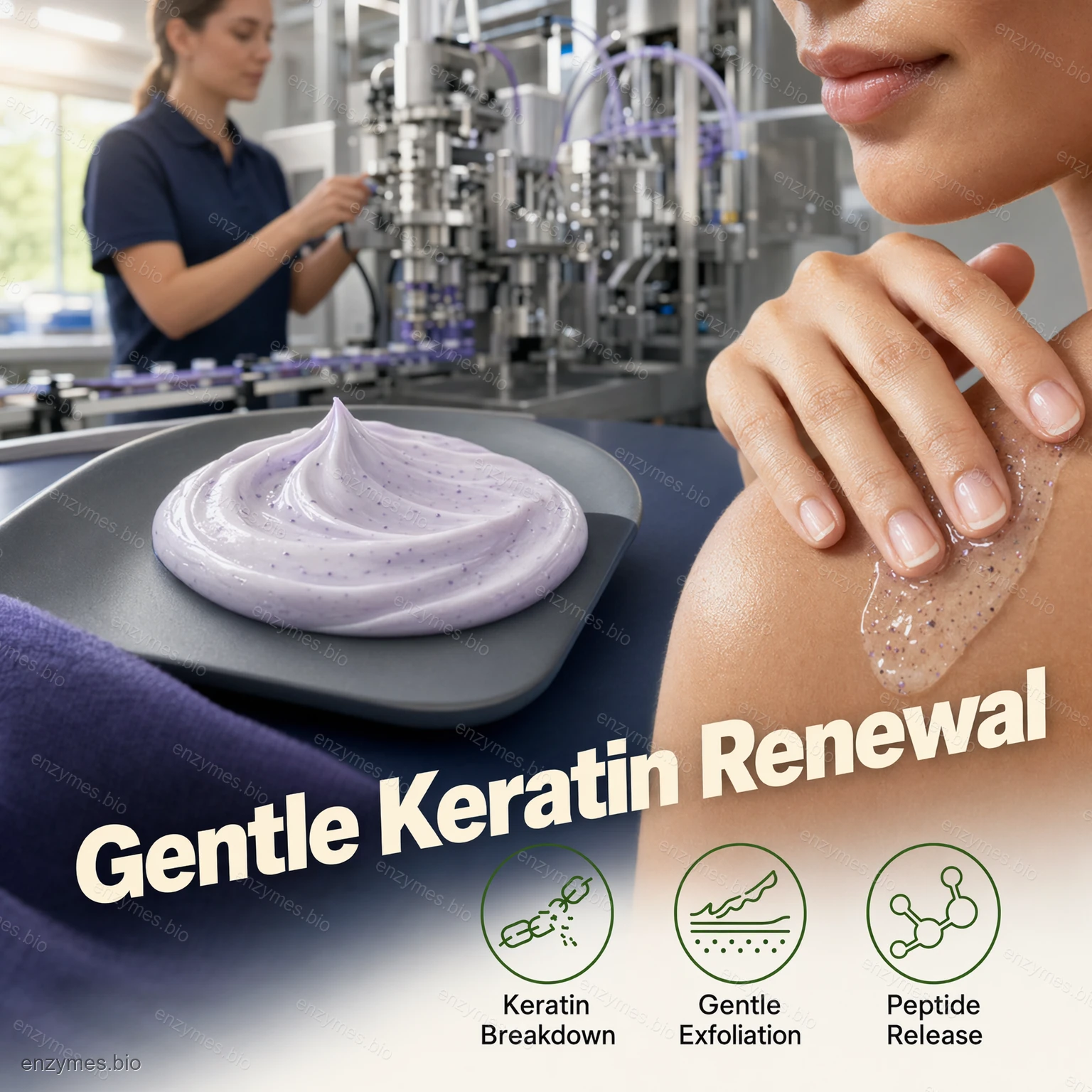 Enzima ajută la îmbunătățirea moliciunii pielii și a curățeniei suprafeței, susține prelucrarea eficientă în condiții moderate și promovează reînnoirea keratinei și activitatea metabolică în utilizări legate de cosmetică. Profilul său de acțiune ușoară permite o performanță eficientă, menținând în același timp integritatea materialului.