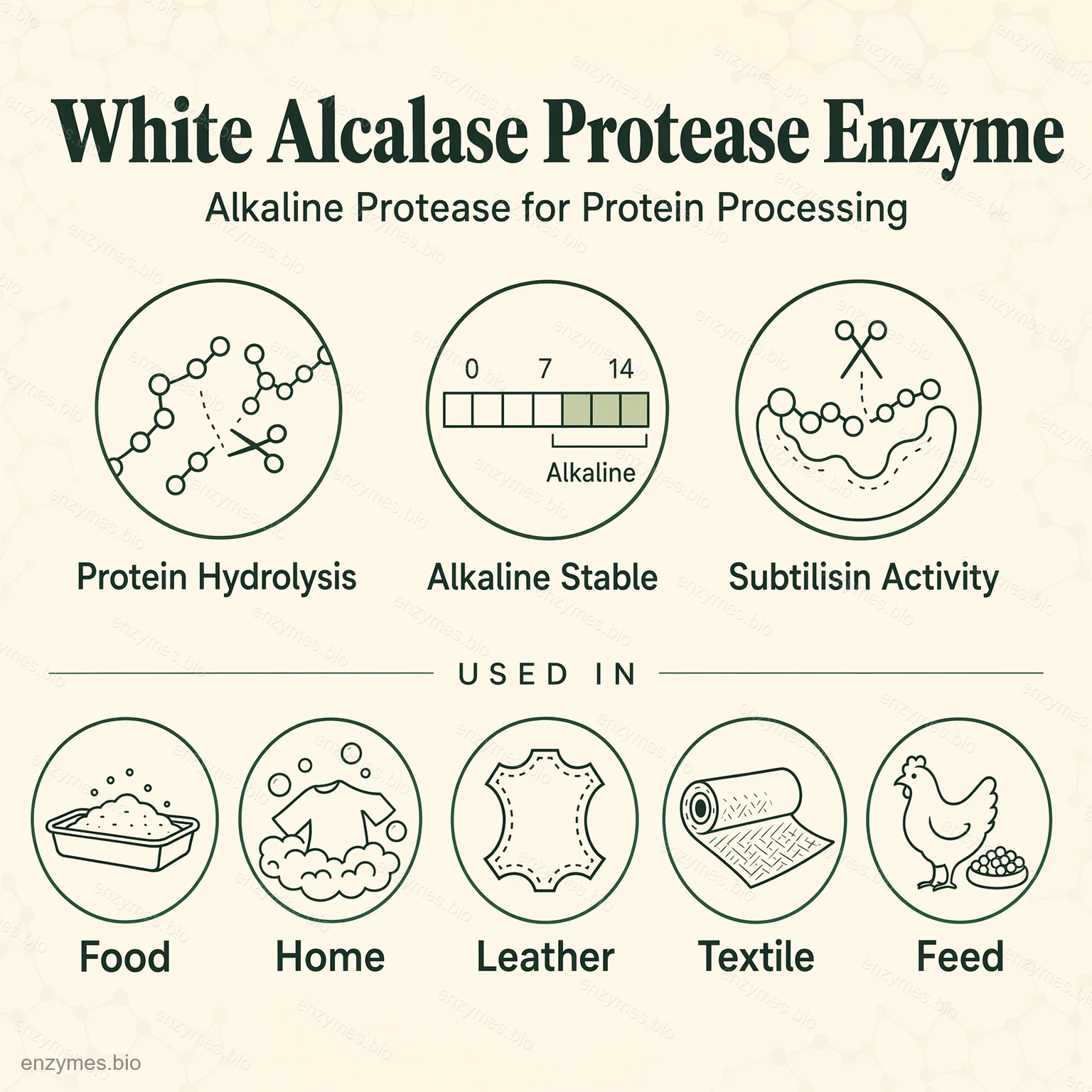 Описание: Алкалазная протеаза производится путем ферментации Bacillus licheniformis. После обработки биологической технологией экстракции, микрофильтрации, ультрафильтрации, сублимационной сушки или опудривания, грануляции и рафинирования.