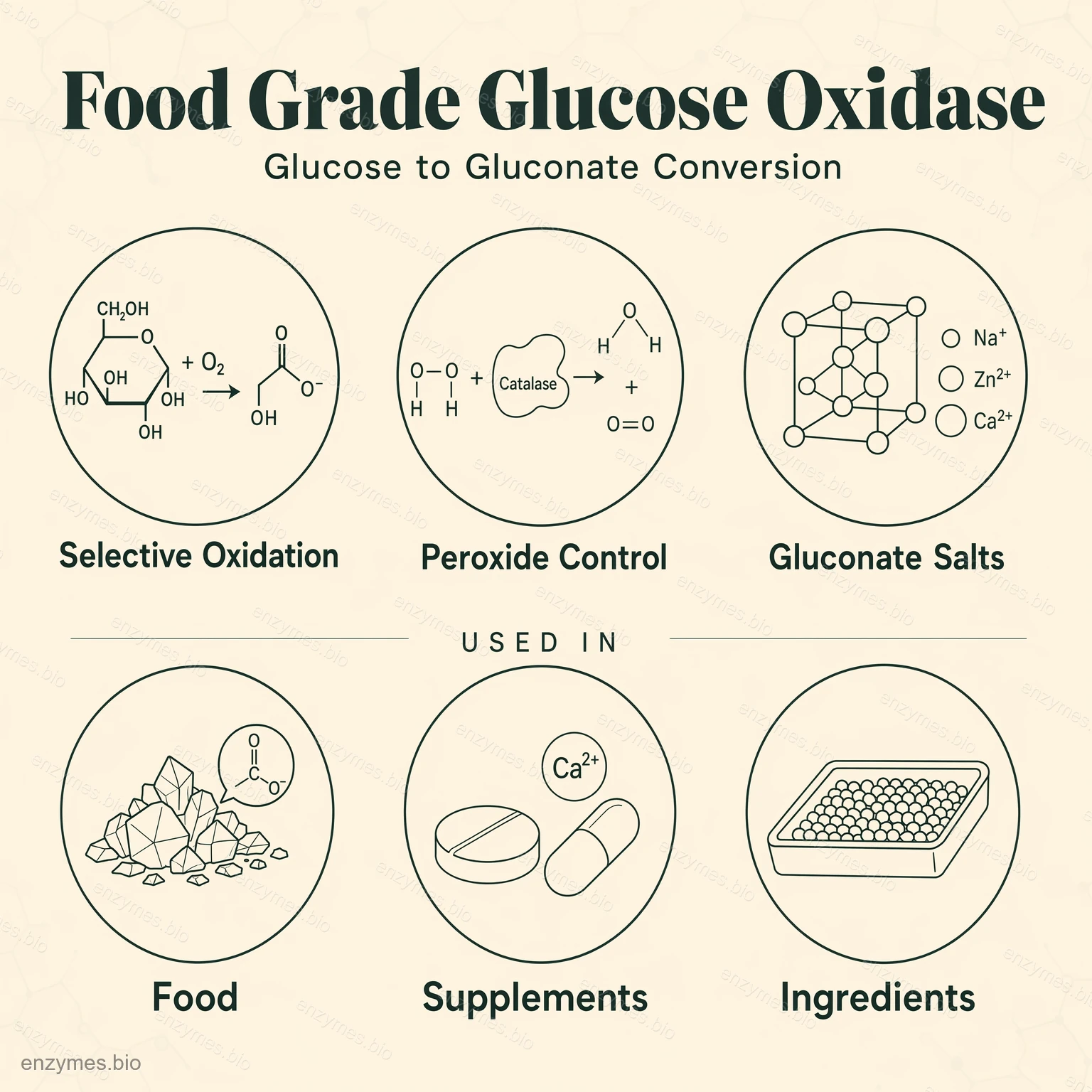 В аэробных условиях глюкозооксидаза селективно катализирует окисление глюкозы с образованием лактона глюконовой кислоты, одновременно потребляя кислород и вырабатывая перекись водорода. Затем лактон подвергается гидролизу с образованием глюконовой кислоты. В промышленности фермент обычно используется вместе с каталазой (ферментом, разлагающим перекись водорода) для поддержания стабильности реакции и повышения общей эффективности процесса.