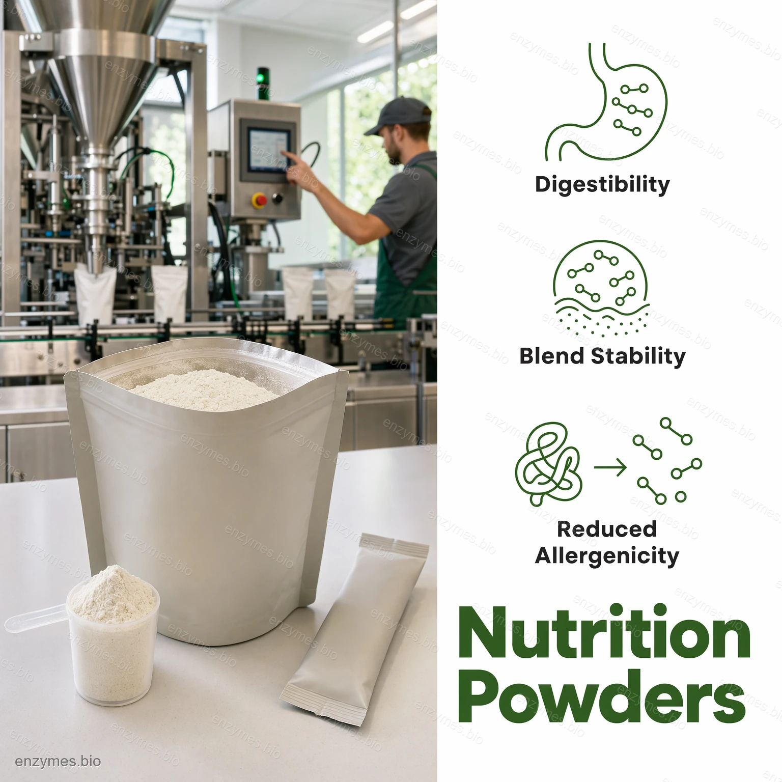 Ферментативный гидролиз — эффективный метод модификации свойств белка. Гидролизованный соевый белок легче усваивается, что делает его отличным способом повышения питательной ценности соевого белка. Фермент для производства соевых пептидов разработан специально для гидролиза соевого белка в соевые пептиды. Благодаря контролируемой ферментативной обработке он производит пептиды с множеством биологических функций, способствует улучшению усвояемости и всасывания, снижает аллергенность и повышает общую питательную и функциональную ценность соевого белка.