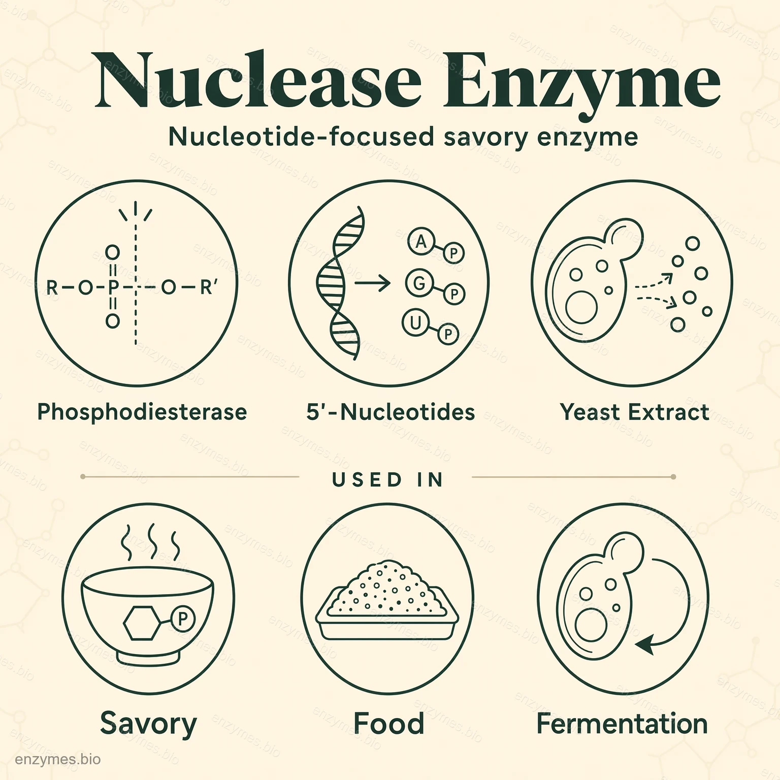 This product is a 5′-Phosphodiesterase preparation produced by submerged fermentation of Penicillium citrinum followed by purification, formulation, and drying. Nuclease has important applications in industrial production of 5′-nucleotide and savory product production like yeast extract.