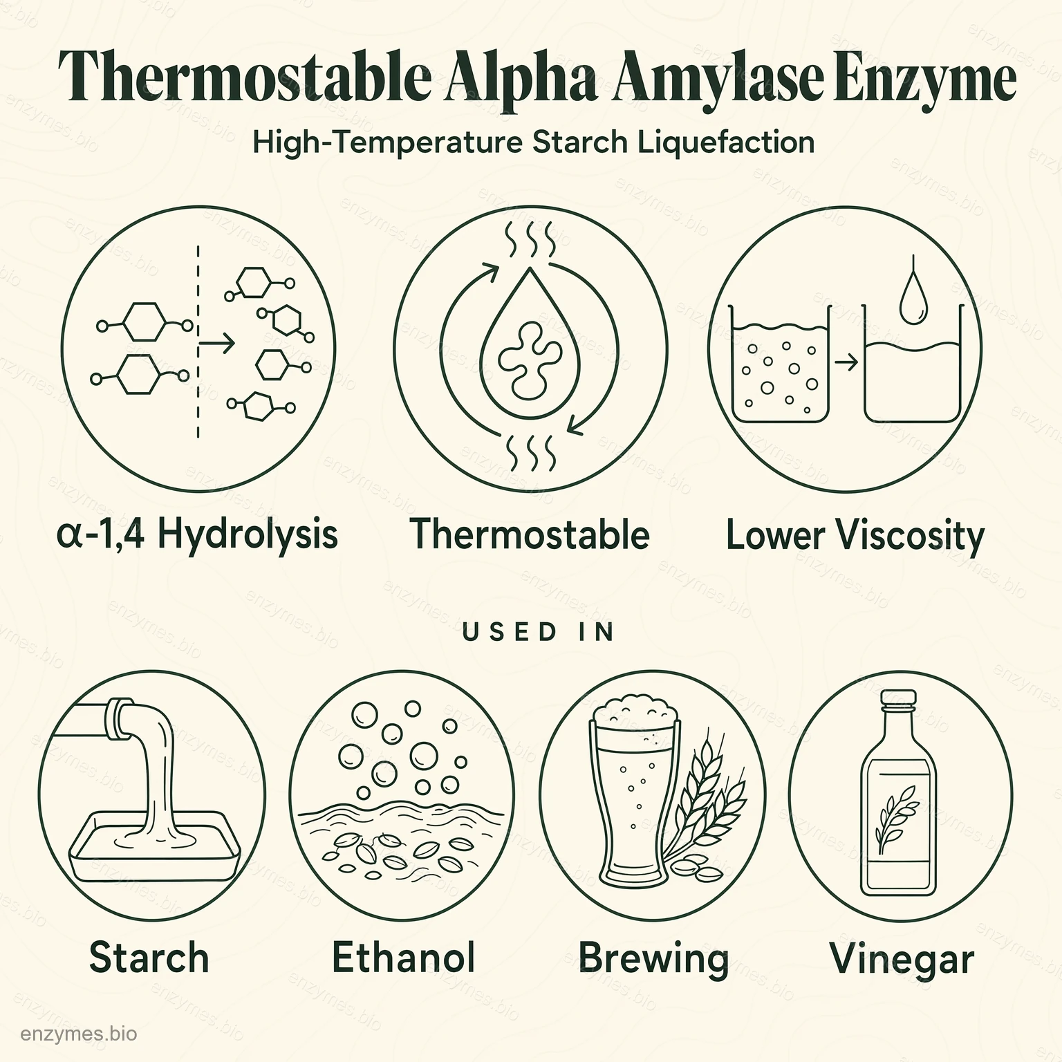 Termostabilná alfa-amyláza sa vyrába submerznou fermentáciou Bacillus licheniformis, po ktorej nasleduje čistenie a formulácia. Odolnosť enzýmu voči vysokej teplote umožňuje skvapalniť škrob a znížiť viskozitu pri želatínovaní, čo prináša množstvo výhod pre spracovanie škrobového cukru.