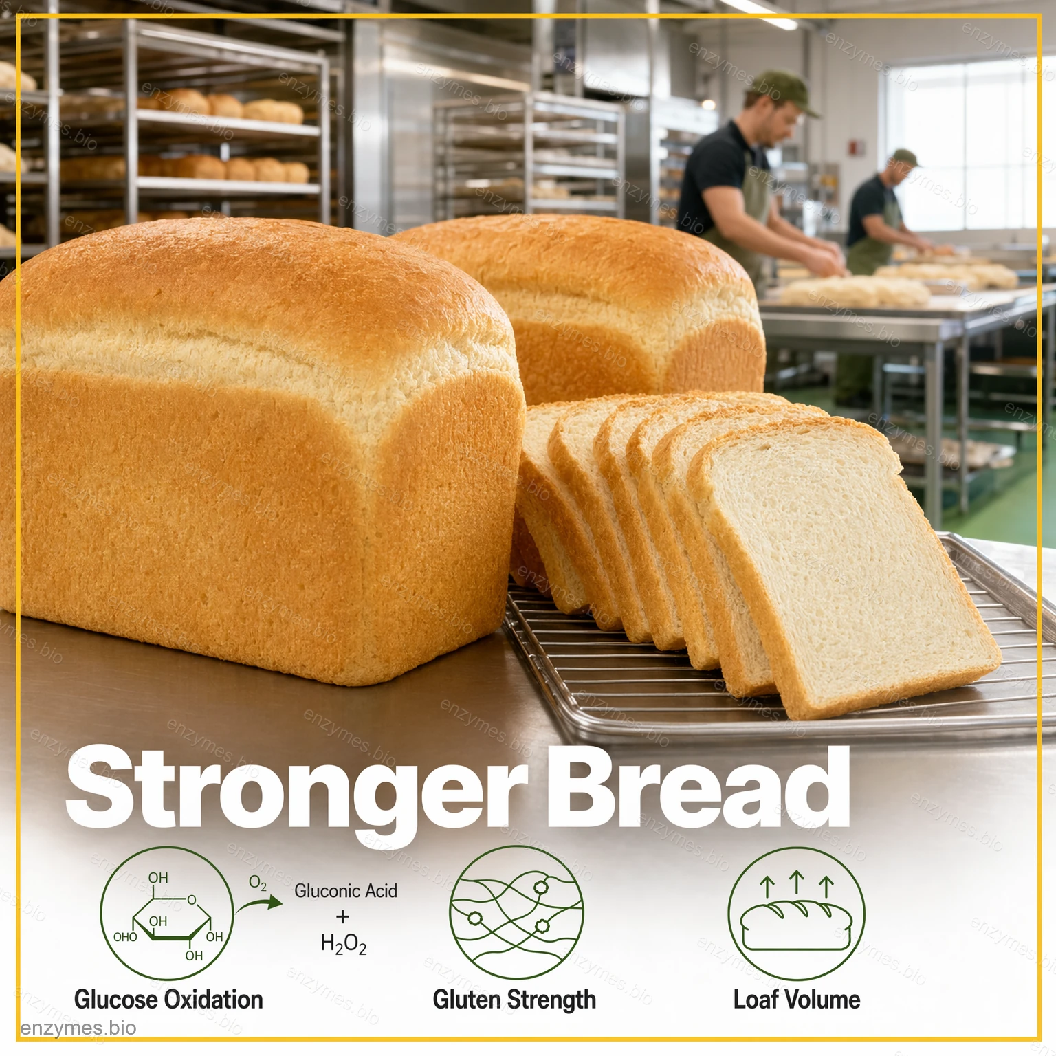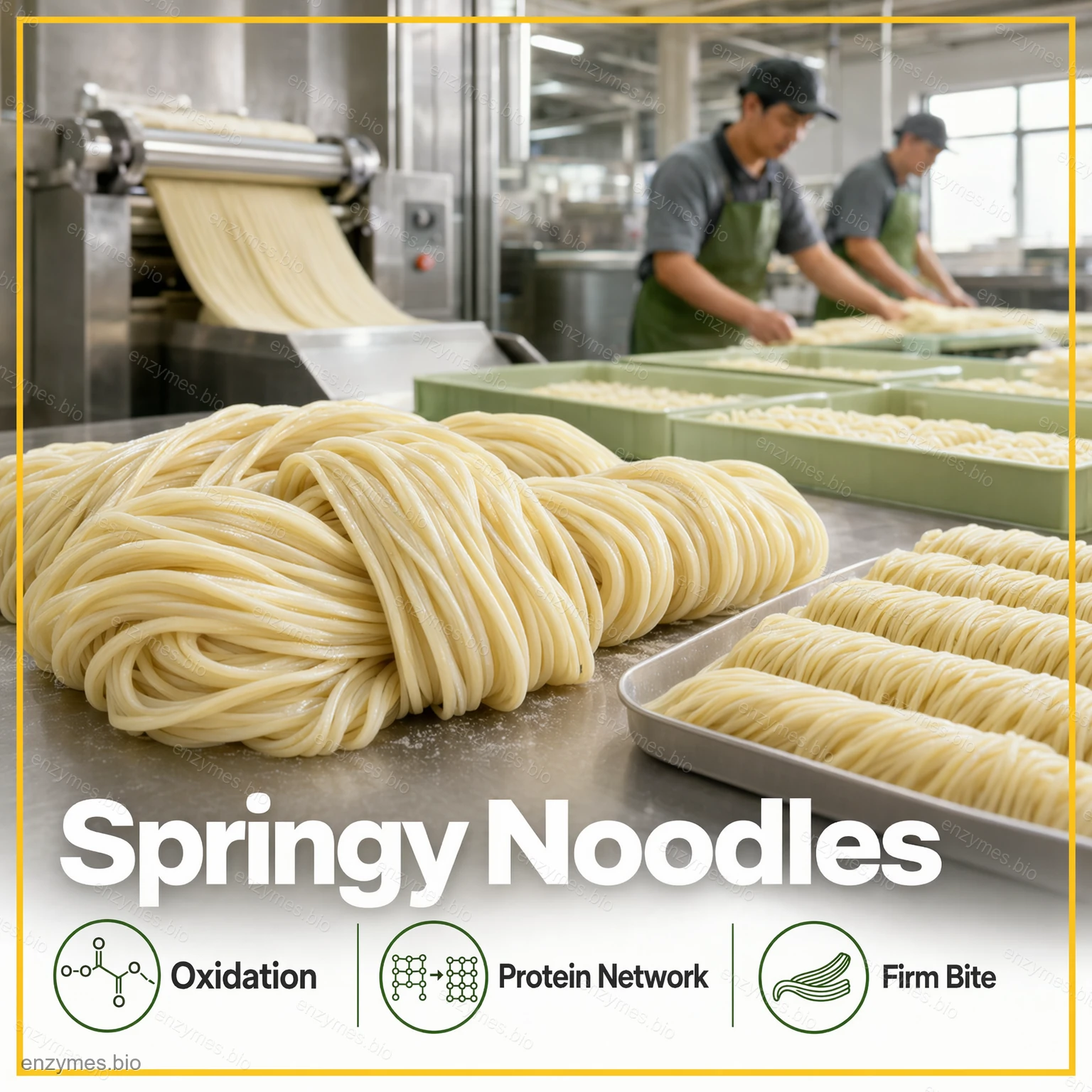 • Vloga glukozne oksidaze v pšenični moki: Glukoza oksidaza lahko pretvori glukozo s prisotnostjo kisika in vodikovega peroksida, s čimer poveča moč glutena, izboljša razteg testa in poveča volumen kruha. Pri proizvodnji rezancev glukoza oksidaza ustvari dobro mrežno strukturo beljakovin, kar poveča moč rezancev.